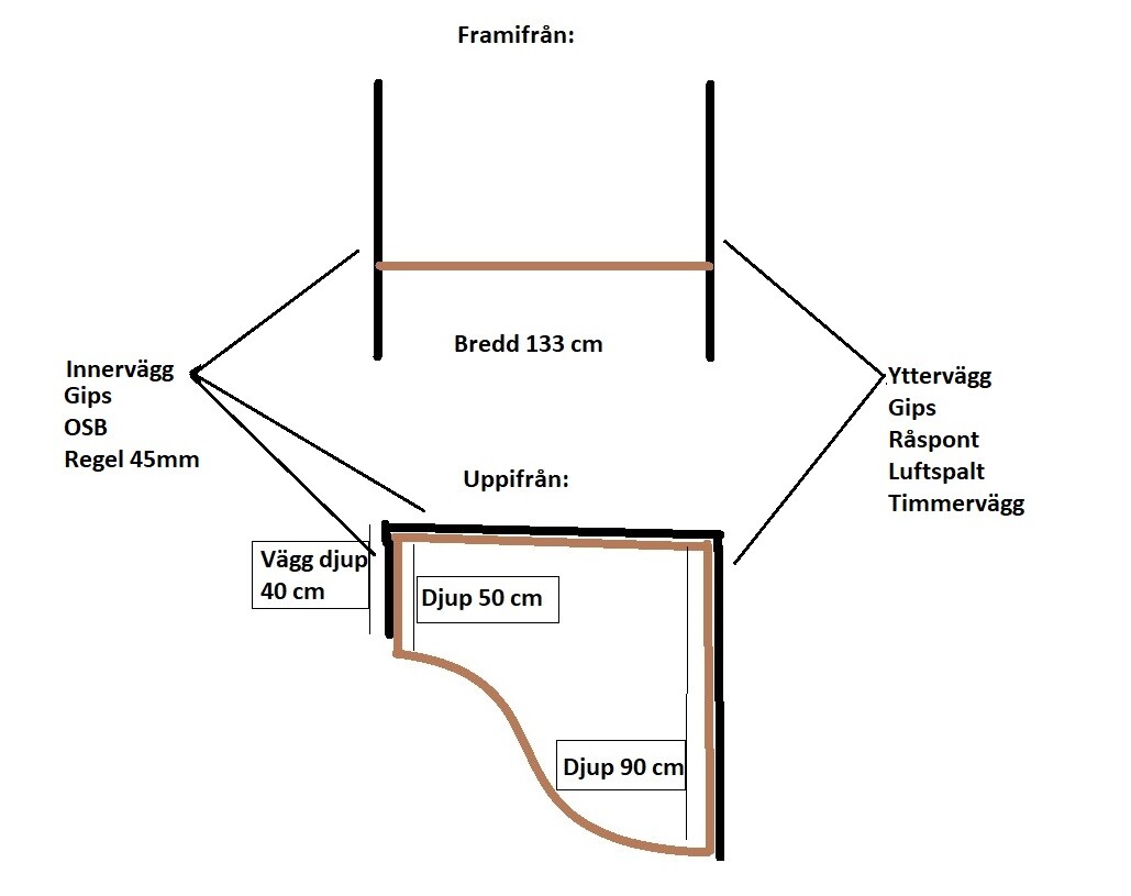 Jag tänkte fälla in en sittbänk mellan två väggar. Materialet i sittbänken tänkte jag skulle vara en bänkskiva av ek 27mm för att få den riktigt stabil. Min förhoppning är att kunna lösa detta utan några stödben, för att få den att se svävande ut.