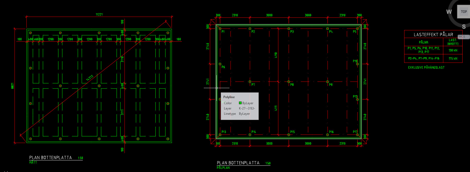 Du pratar om vanlig platta på mark, det du ser är för pålade villor. Helt olika tankesätt/dimensionerings förfarande. I bifogat exemplet är den dimensionerad för 27kN/m huslast + plattans egenvikt + nyttig last på betongen.Kallebo skrev:Det DÄR ser lite klent utVad kan en sådan konstruktion ta för linjelaster?