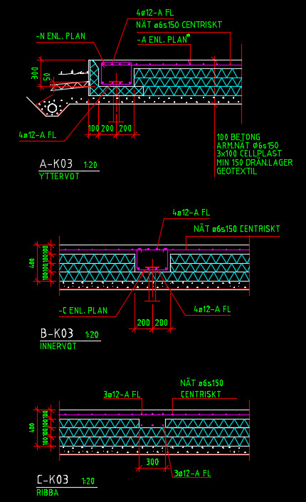 När jag fick konstruktionsritningarna till min grund, fick jag känslan av att det var cellplasten som skulle ta upp de stora krafterna. Vid en 40 kN punktlast var skillnaden endast att ett lager frigolit togs bort och ett extra 5150 nät skulle läggas i botten. Vid större linjelast än normalt skulle voten göras lite bredare.