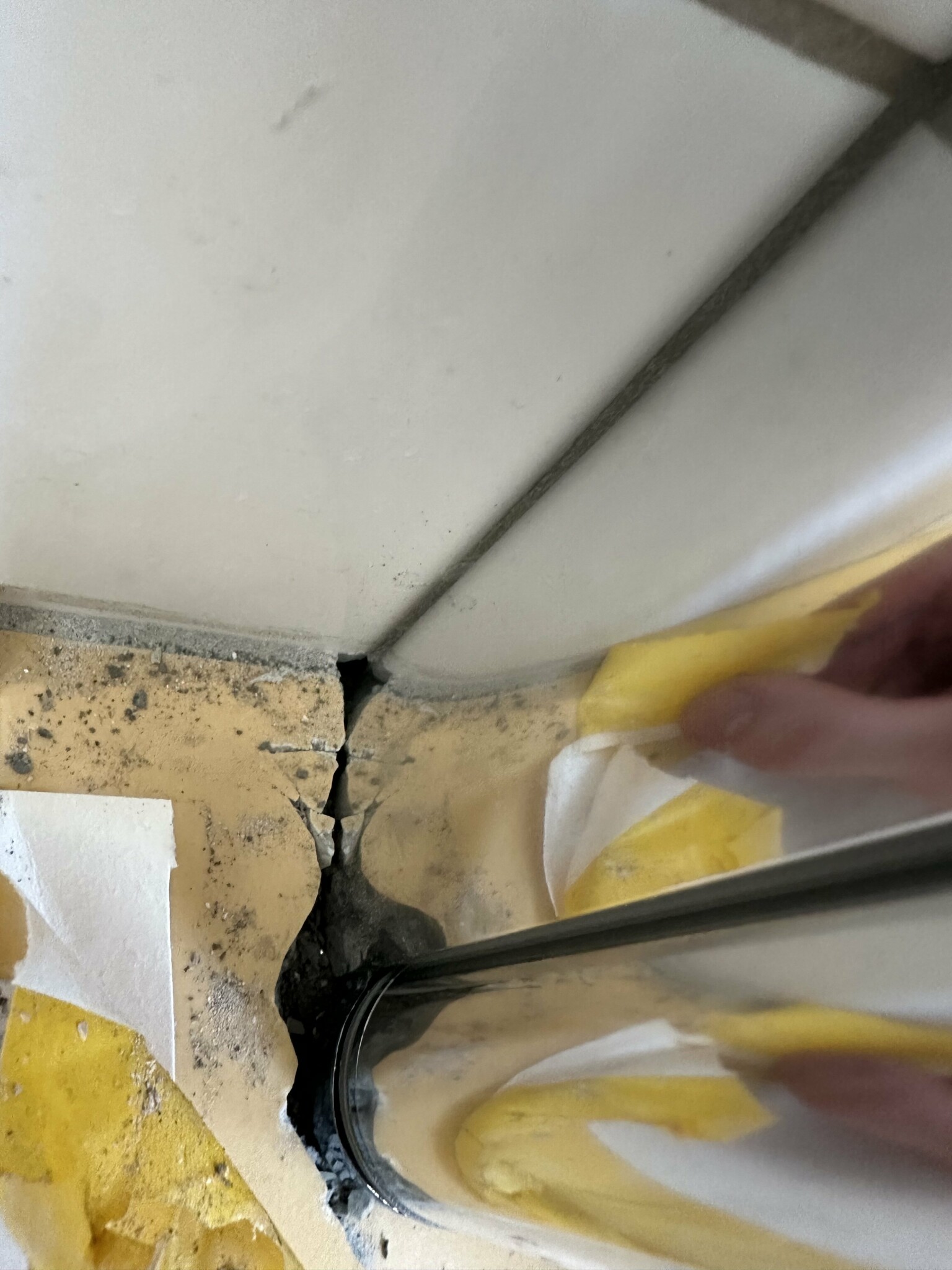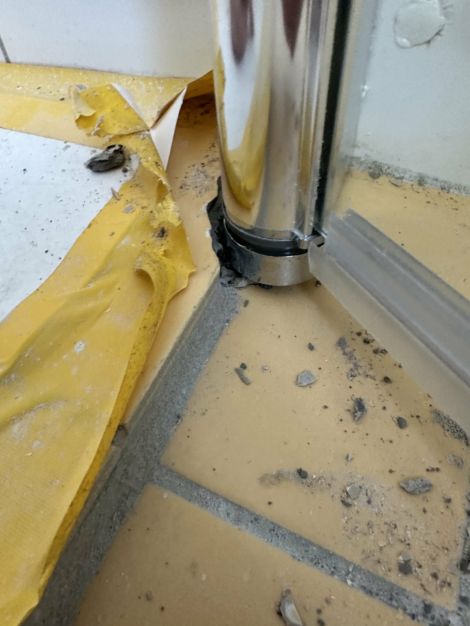 Ja ni… han nämnde att duschväggen gick att höja på något sätt. Det här är precis som jag befarade. Ska prata med plattsättaren. Men om jag bara ser kakelfix så bör tätskiktet vara intakt eller?