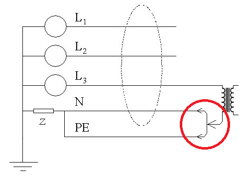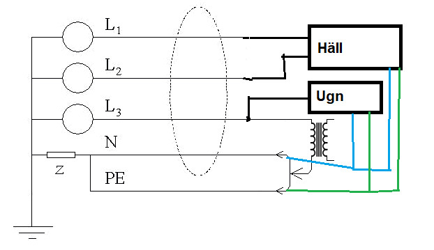 Det jag beskriver här är FELFALLET när det blivit en felaktig hopkoppling av nolla N och skyddsjord PE (t.ex. av misstag) då löser en korrekt fungerande jordfelsbrytare om strömmen genom jordfelsbrytaren överstiger utlösningsvärdet (30 mA)