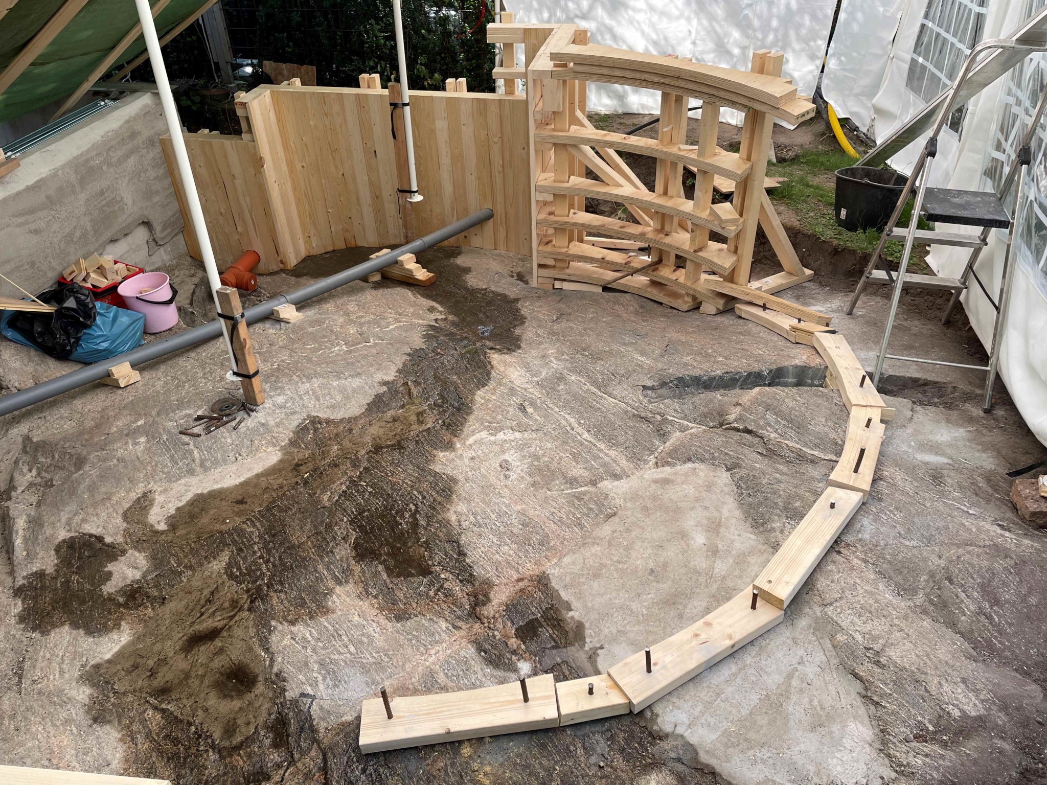 Det andra skälet var att vi inte ville skapa så mycket hinder när väl betongbilen anländer och man då behöver lite fri yta och hantera slangen från pumpbilen. Men, som sagt, jättebra om någon mer som verkligen har kunskap om formbygge kunde reda ut detta för oss glada amatörer!