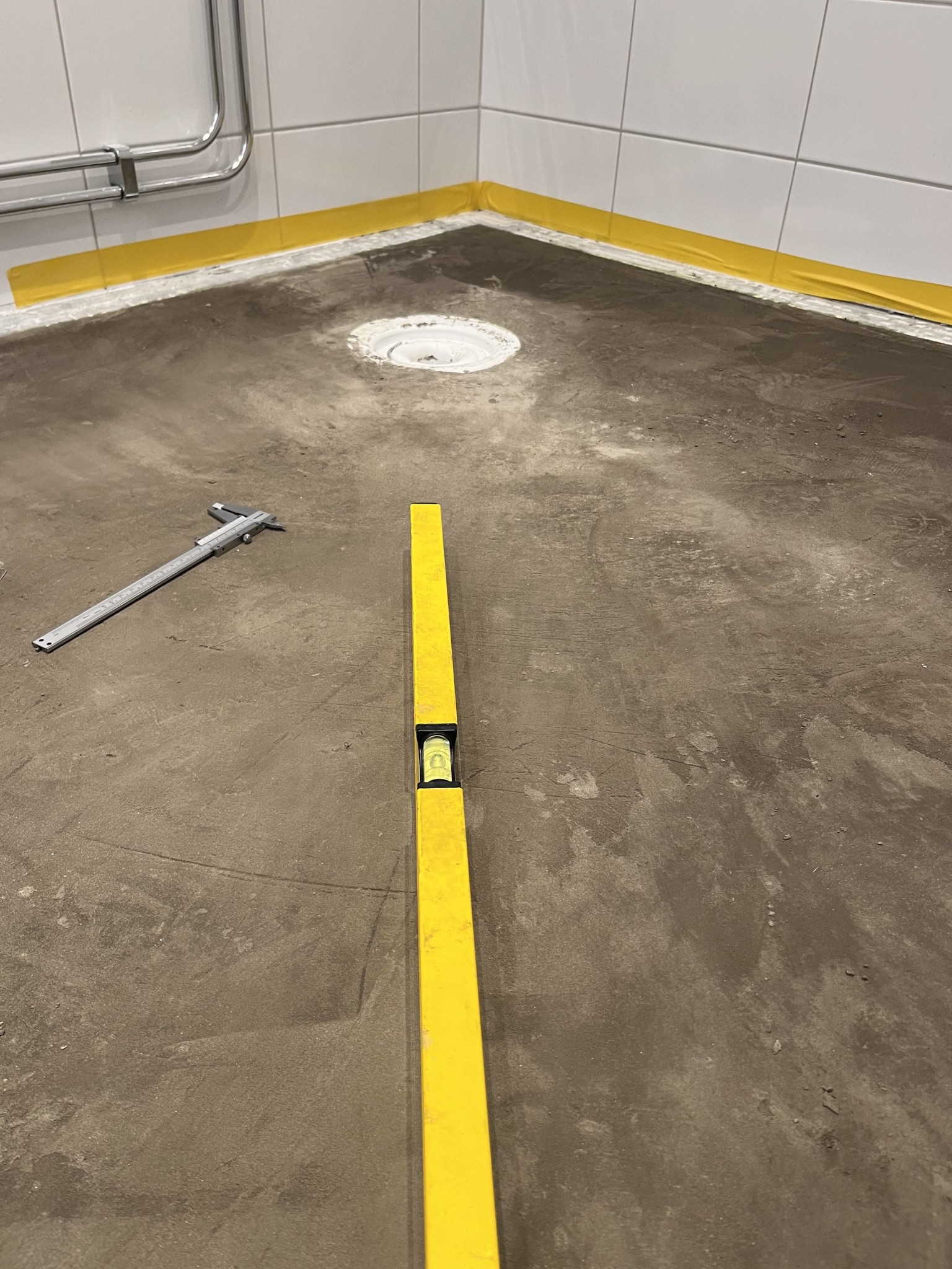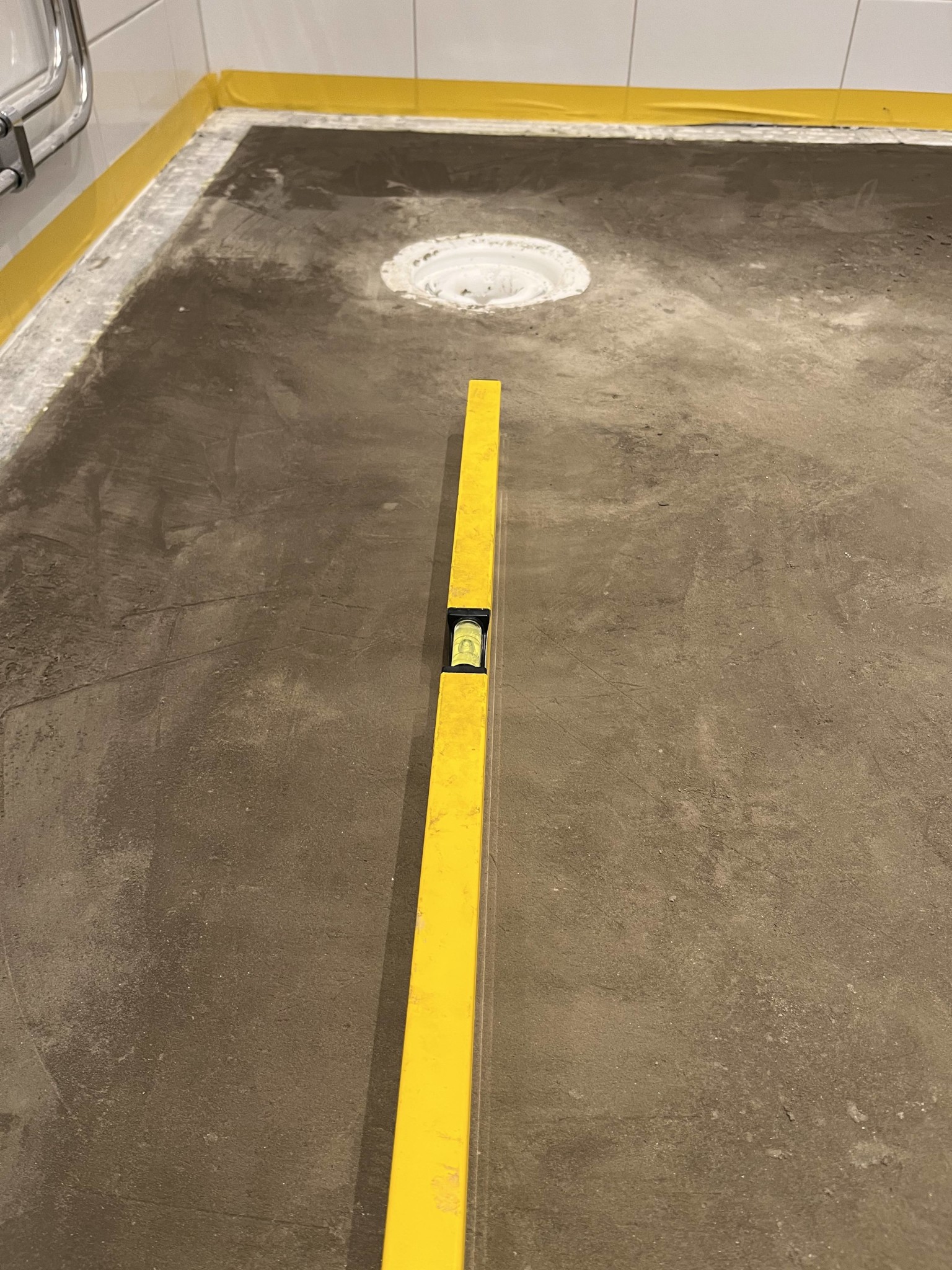 Spontant känns det både bättre och enklare att ta bort nedersta kakelraden på väggen och skarva tätskiktet där. Då kan man flyta hela golvet och slipper en vattenränna runt hela golvet.