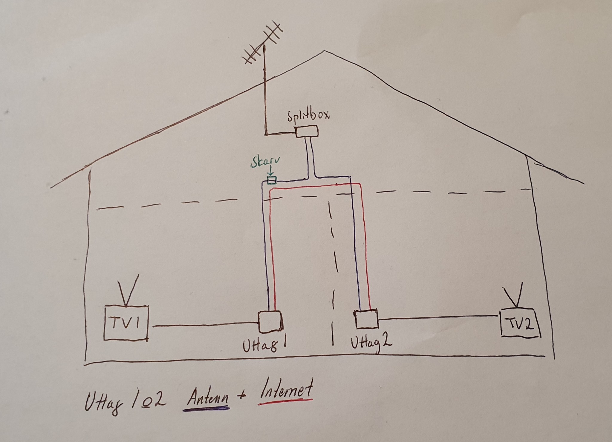 Efter detta har TV1 (smart-TV, 5-6 år gammal) börjat krångla med kanalmottagningen (TV2, en +10år "dum" LCD funkar hur bra som helst). Ibland har vi mottagning i några timmar (och sedan försvinner den), men oftast har vi ingen mottagning alls. Sedan innan har antennslingan en skarv som reducerar ner kabeln för att den ska gå ner i PVC-röret, vilket är nödvändigt för att få rum med både antenn och ethernetkabel.