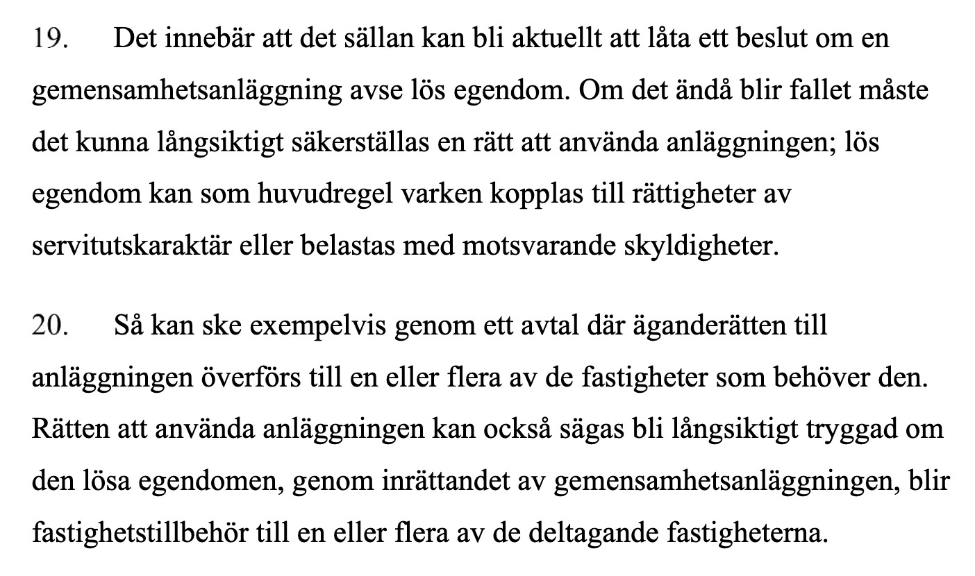 Vad gäller upplåtelsefrågan tycker jag att HD skriver på ett olämpligt sätt. Visst är det så som skrivs i domslutet att "en gemensamhetsanläggning i ett fall som detta kan inrättas i lös egendom", men det är ju också så att egendomen slutar vara lös. Jag tror därför att Lantmäteriets handbok inte borde behöva skrivas om så mycket. Man hade kanske kunnat uttrycka sig mer verklighetsnära i domen och likt Lantmäteriet skriva att egendomen först måste bli fast, eller genom förfarandet blir fast, men det gjorde man inte. Hur som helst tycker jag att det mesta av det Lantmäteriet skriver i frågan i sin handbok fortfarande stämmer även med vad HD kom fram till.
