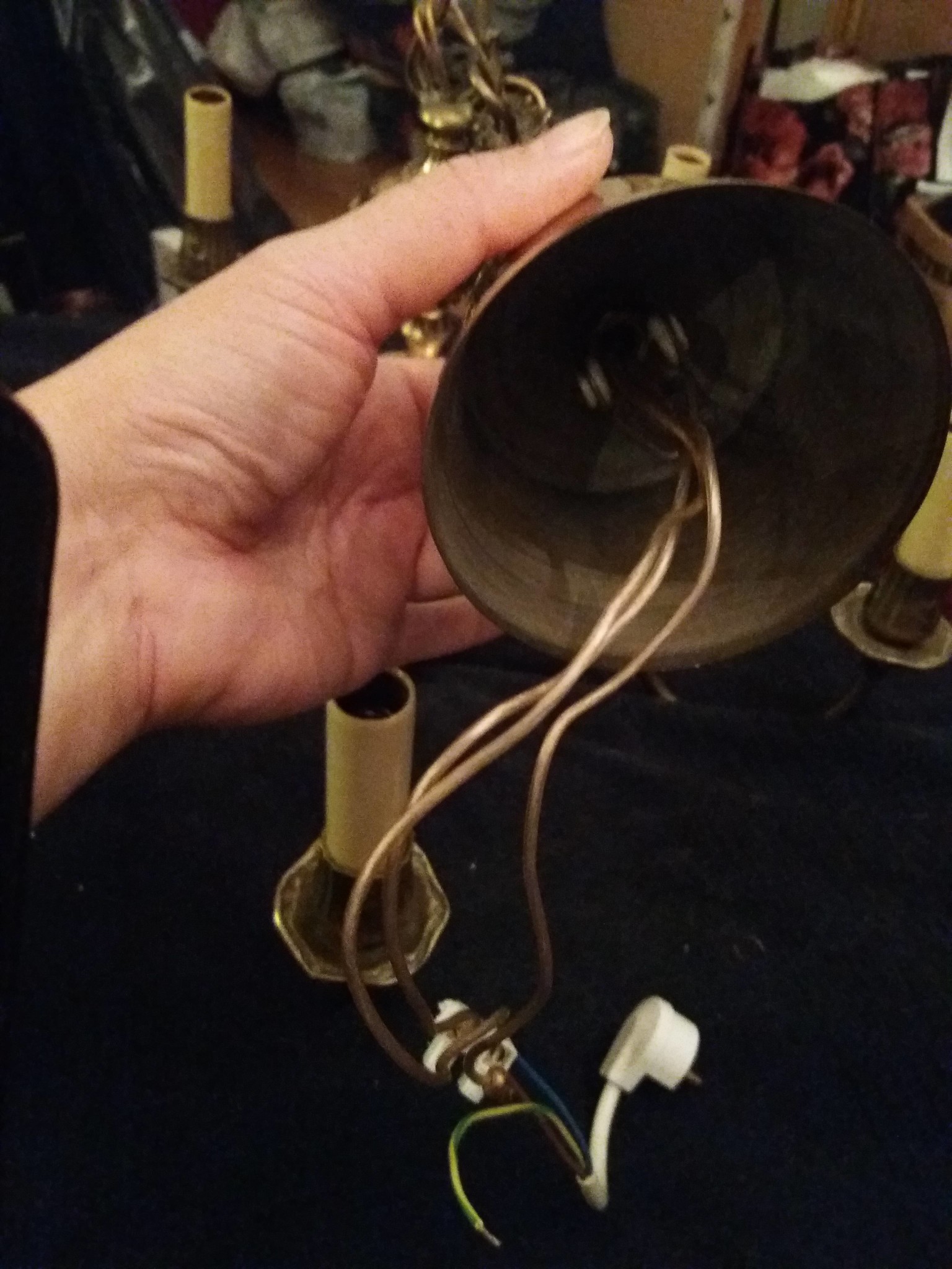 En gammal kristallkrona/mässingarmatur ser det ut som, hur är resten av rummet, med jordade uttag.samt jord i uttaget i taket, då ska även den byggas om till jordat utförande, är rummet helt utan jord så är det bara att hänga upp den och isolera den gul/gröna.