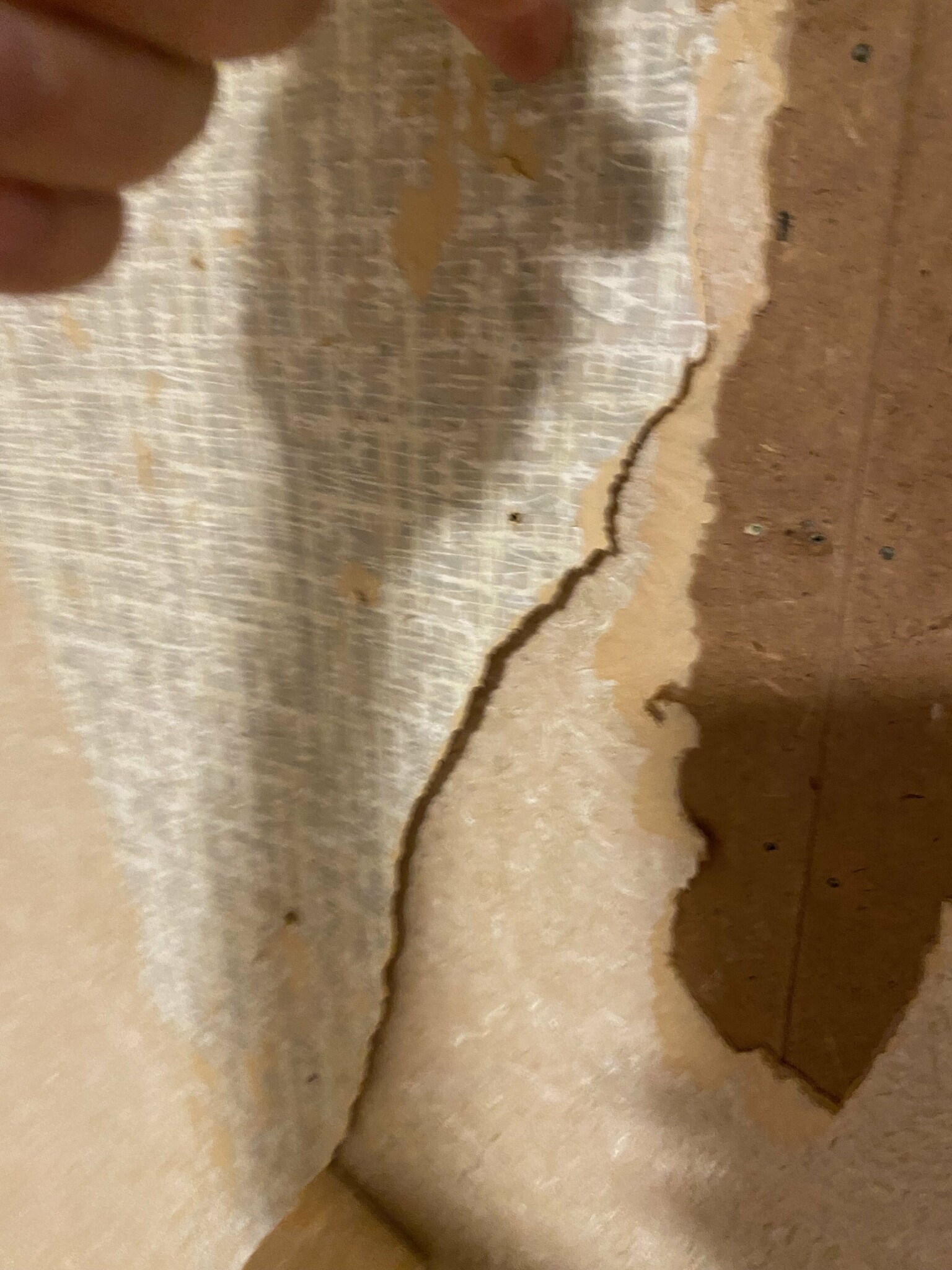 Jag tycker att det ser ut att vara masonit. Det resulterar ofta i att tapeten spricker eller bucklar ut i skarvarna. Finns den typen av skador på de befintliga tapeterna så kan du räkna med att de dyker upp igen.