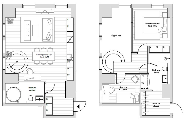 Det var verkligen inte genomtänkt. Köket borde ha varit i hörnet där trappan är istället, och en helt normal men smal trappa som avskiljare. Slöseri på utrymme med två fullstora badrum när det bara är två sovrum också. Men det är svårt att göra så drastisk förändring nu.