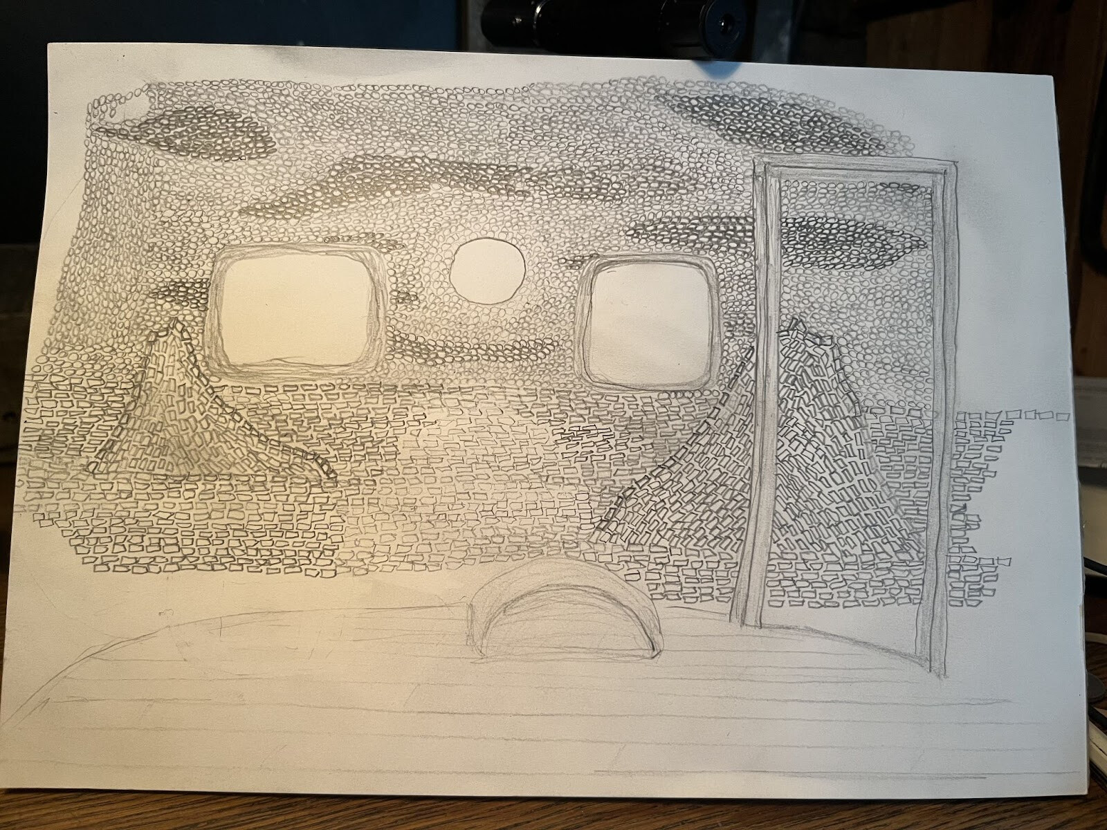 Nu när vi hade bestämt att vi ville ha kork invändigt kunde vi börja fundera på mönster och vad vi ville skapa för typ av design. Som ni ser på bilden på korkväggen i sovrummet har den ett rymdinspirerat tema. Där tänkte jag att det vore en skön kontrast att avbilda en kall rymd med varma korkar. Mer information om detta projekt hittar ni att läsa i min projekttråd "Totalrenovering av 2:a, mitt första större projekt". En liknande kontrast skulle vara kul att få in i detta projekt. Att avbilda is och hav, kylans bärare, i en bastu skulle ge en intressant energi tänker vi. På något sätt så passar kalla bad väldigt bra in i en bastumiljö!När det kommer till vad som är möjligt att göra bra i kork är stora geometriska mönster. Små detaljer funkar mindre bra då upplösningen är vad den är när man jobbar med kork. Att blanda liggande och stående kork, samt att använda det naturligt röda från rödvin för att skapa effekter gillade jag från det tidigare projektet. Jag gillar också idén av att integrera belysning i väggen i form av glaslampor. Vi diskuterade fram och tillbaka och det mynnade ut i att det kommer bli en horisont som går genom hela vagnen med liggande korkar under den som ska symbolisera hav och stående korkar över den som blir himmel. På ena sidan en solnedgång med en lampa som är solen och omgärdad med vinröda moln, på andra sidan en natthimmel med måne och stjärnor i taket. För att visualisera tanken skissade jag upp ena sidan