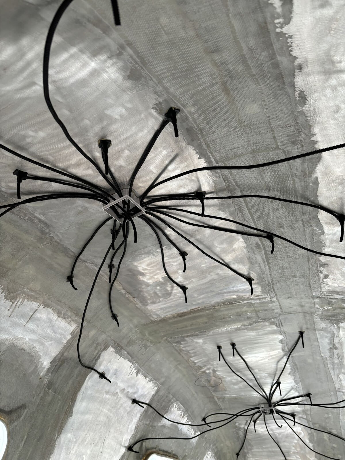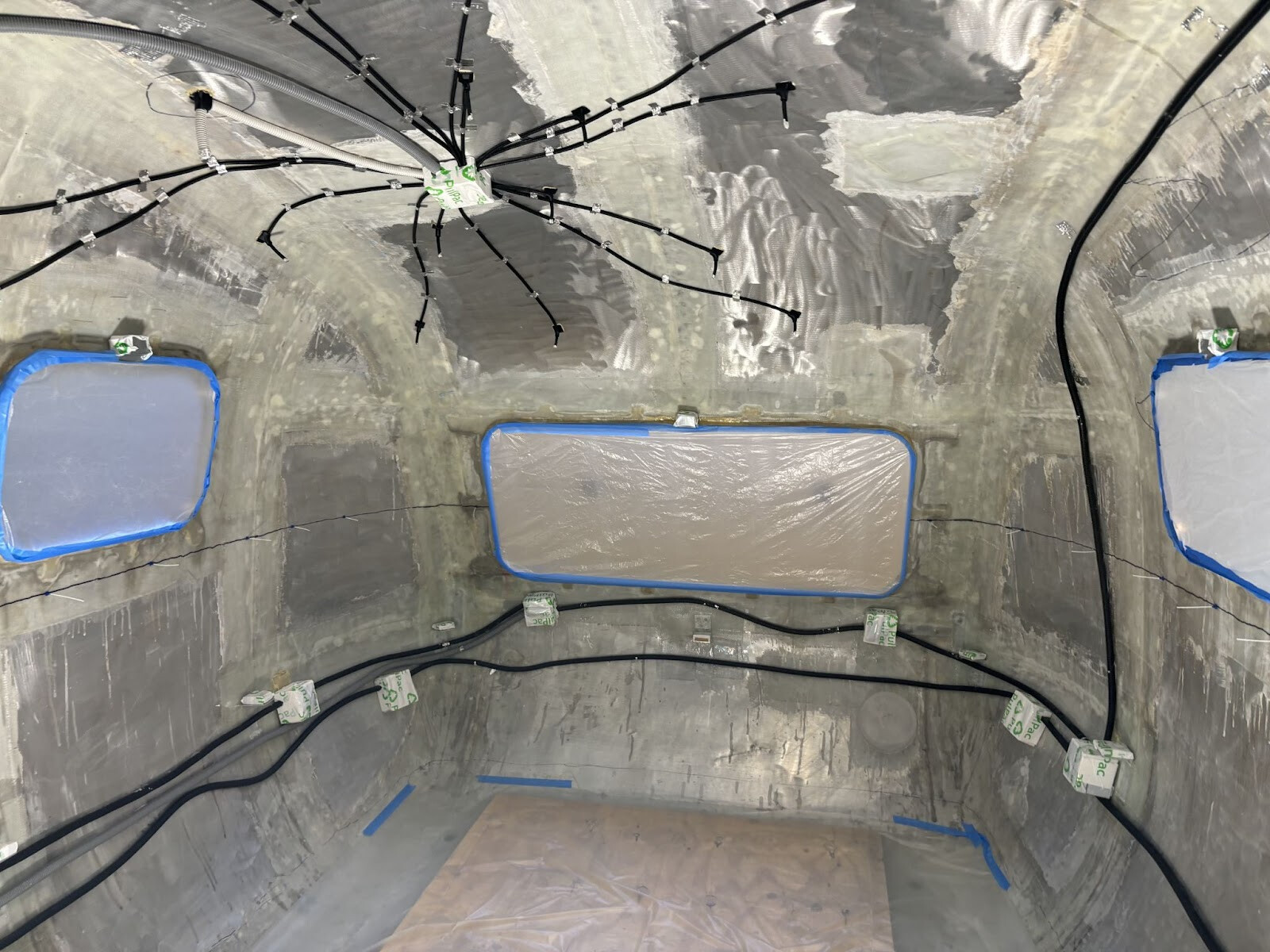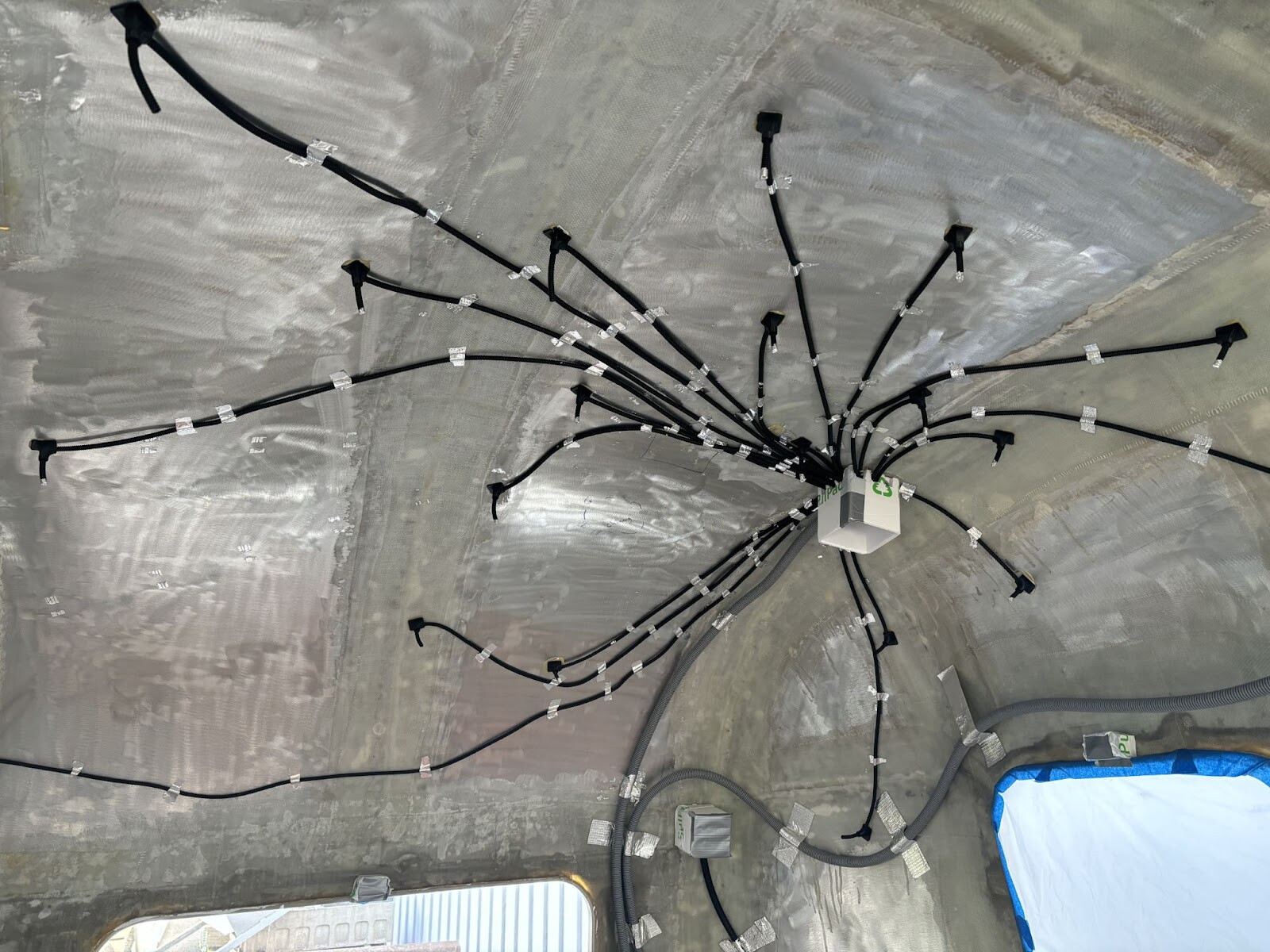 Vi gick på 36 st “stjärnor”, utspridda mest i taket på vagnens högra sida (i färdriktningen). De samlades upp i två eldosor som i sin tur var sammanlänkade med dosor placerade nära där cylindern med batteri och elcentral skulle sitta. Det såg nästan lite läskigt ut med två jättespindlar i taket, som tur var skulle de bäddas in i ett täcke av skum. 😀