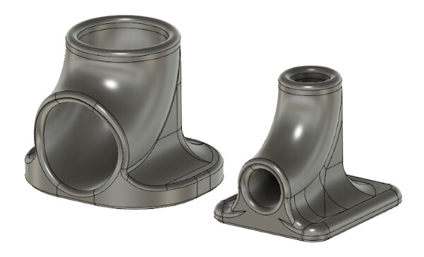 Som ni ser i bilderna på bänkfästena mm så sitter det en del elslangar upptejpade på väggarna. Dags att nämna några ord om dem. Det är två helt separata system, ett för trafikbelysningen med dosor där lyktor och positionsbelysning etc. sitter och ett annat för inre belysning och högtalare. Så för att kunna placera ut dessa slangar var det redan nu läge att bestämma positionen för vägg- och taklampor. Där en kabel kommer ut från väggen till en lampa tänkte jag att det var bra om kabeln kom ut vinkellrätt så slangarna som leder ut till lamporna måste gå längs plåtskalet och sen göra en tvär sväng där de mynnar. Radien kunde inte vara för stor då den måste helt bäddas in i isoleringen. Detta var ett perfekt jobb för 3D-printing! En liten böjguide för slangen som har en limyta på sig.