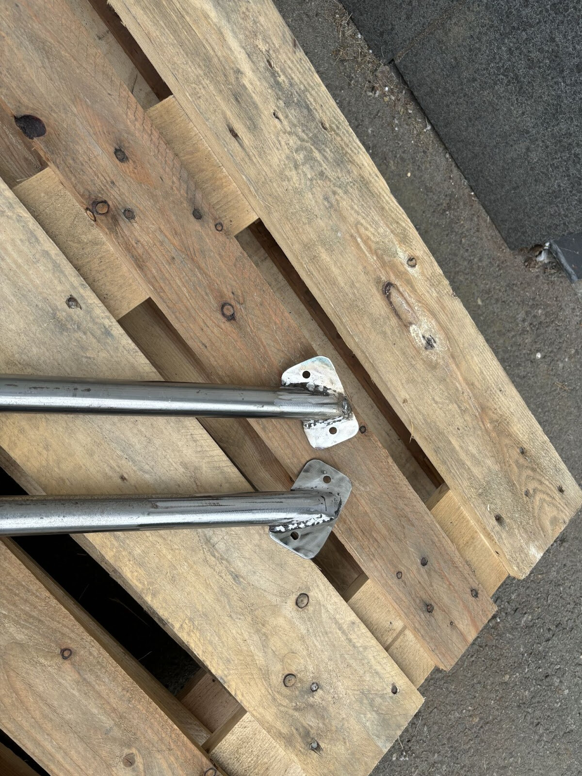Efter lite utmanande vinkelmätning så svetsades plåtbitar på stagen för infästning