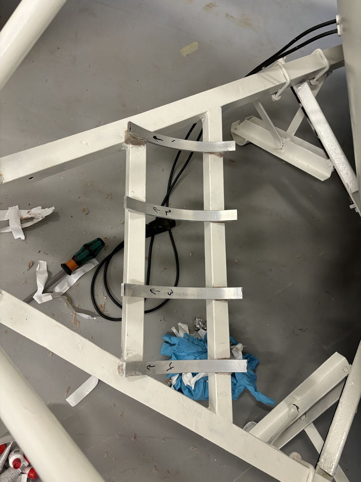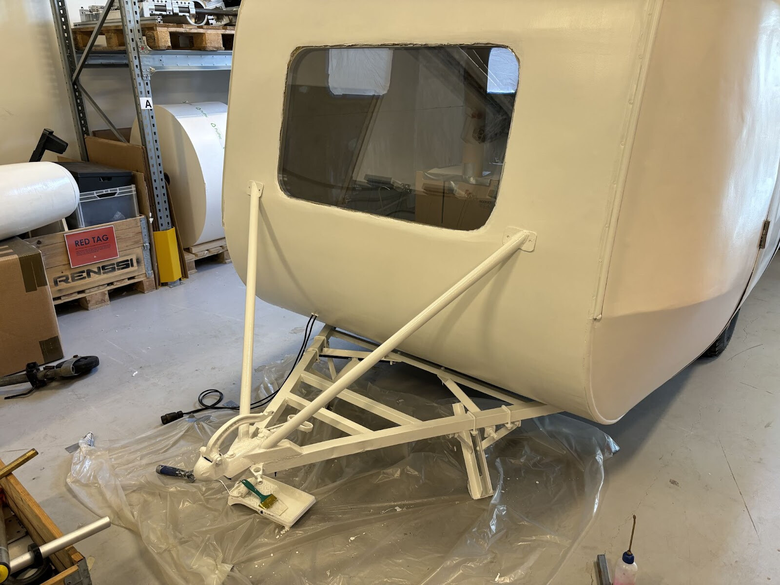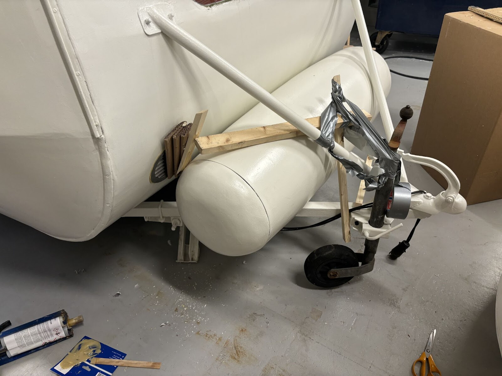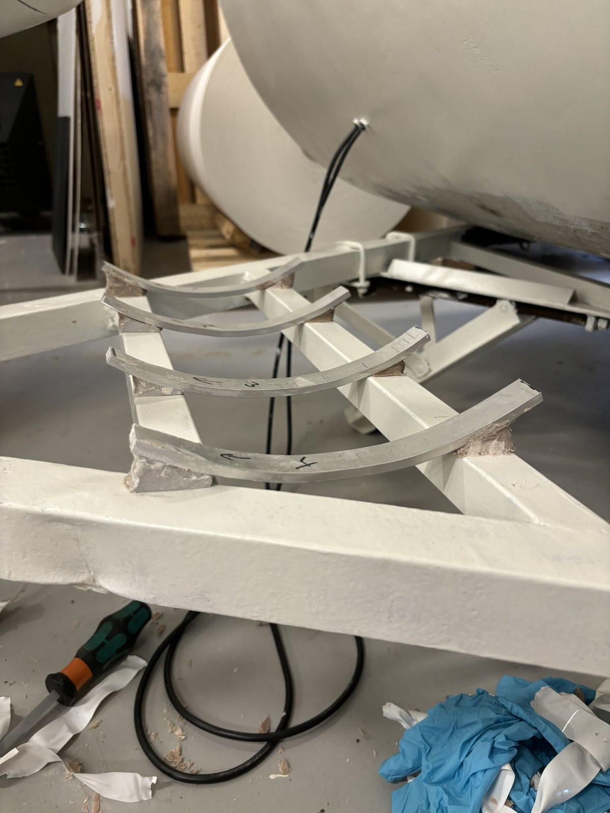 Två fyrkantrör svetsade jag fast under där cylindern kommer ligga. Det är inte helt självklart hur en sån här cylinder ska fästas. Den är ju också dubbelkrökt så den följer ju inte något som är rakt. Allt målades i alla fall färdigt så får jag klura ut resten sen. Jag skulle vilja bulta ner genom cylindern i dessa nya fyrkantrör. Men alla bultar skulle ha olika avstånd från cylinderytan till fyrkantrören. Det slutade med att jag bockade till bågar av överbliven aluminiumsplattstång från fönsterramarna. Jag kunde hyfsat enkelt få dem till rätt radie för olika positioner på cylindern så det var bara att komma på hur jag skulle individuellt låsa dem i rätt höjd. Jag funderade på om det skulle gå att mäta upp det på något sätt för att kunna printa ut små distanser. Kom inte på någon bra metod för det så jag gick på en mer handfast metod som innebar att fylla ut utrymmet mellan ramen och aluminiumbågen med något som skulle kunna härda till rätt form. Jag hade kvar en del glasfiberspackel som jag inte hade någon användning av nu när vagnen är målad. Visste inte om det skulle göra jobbet men värt ett försök i alla fall.