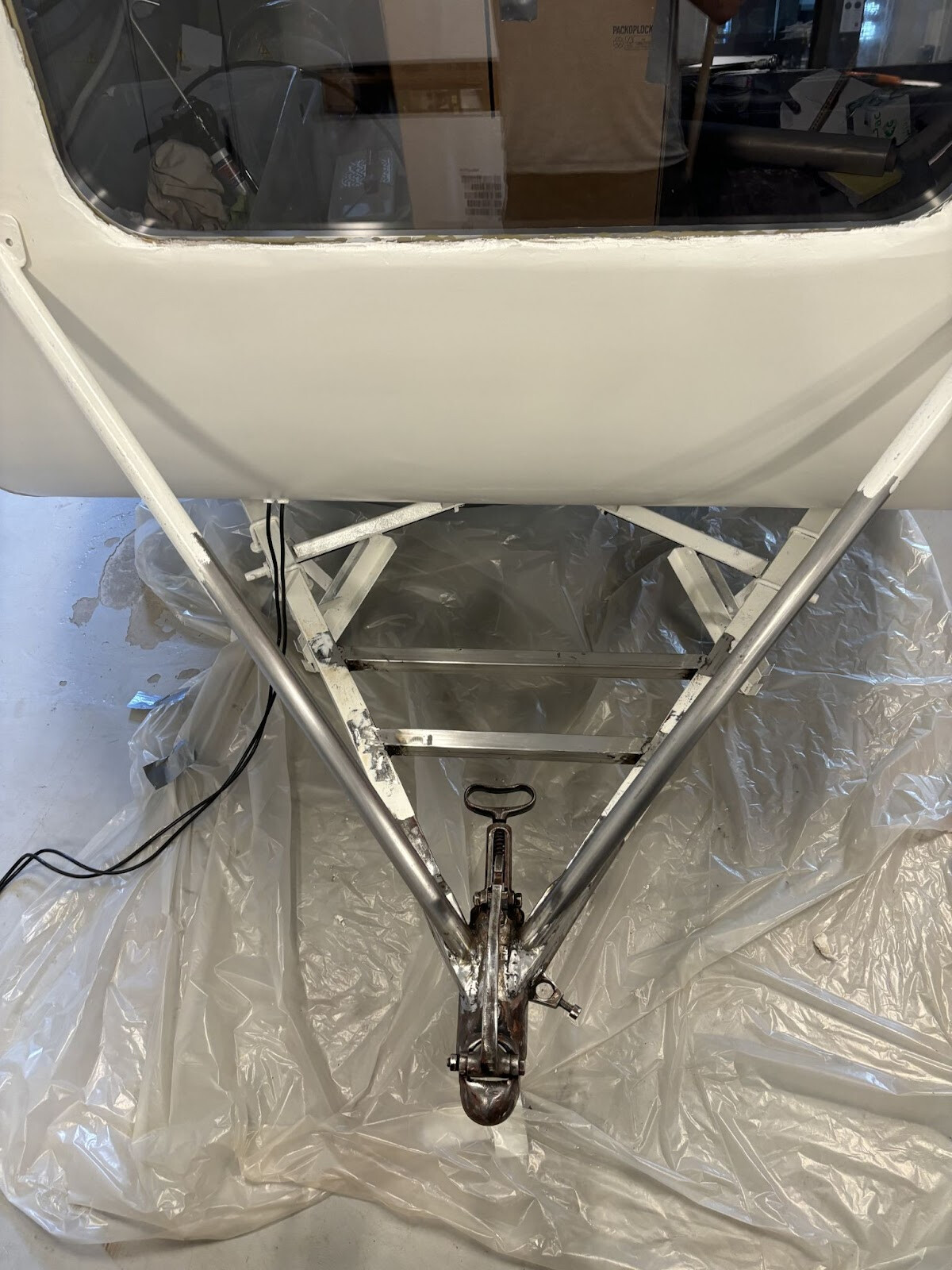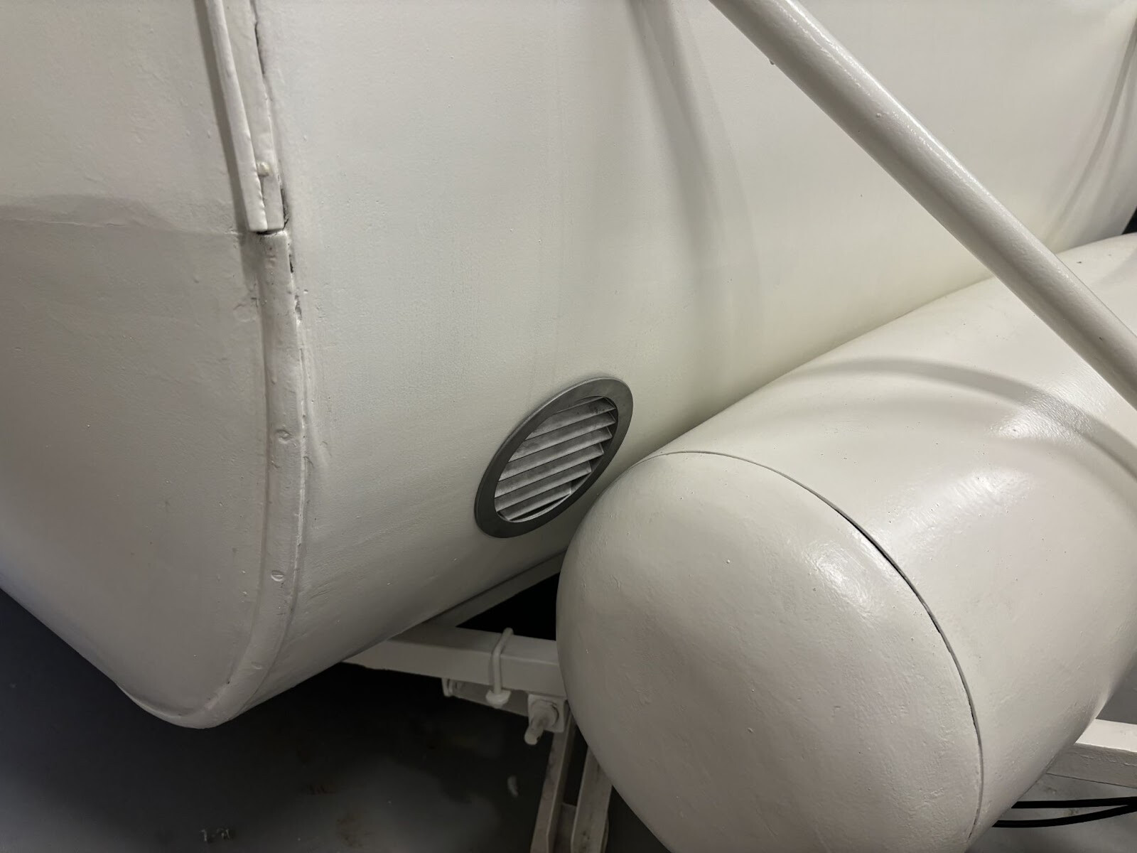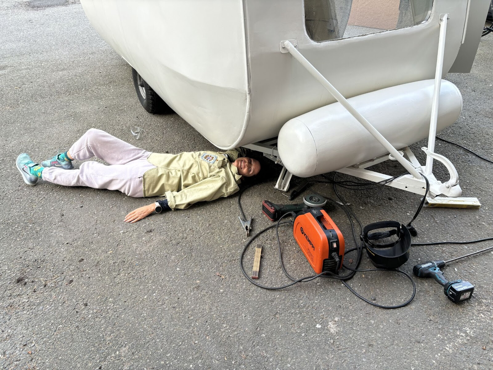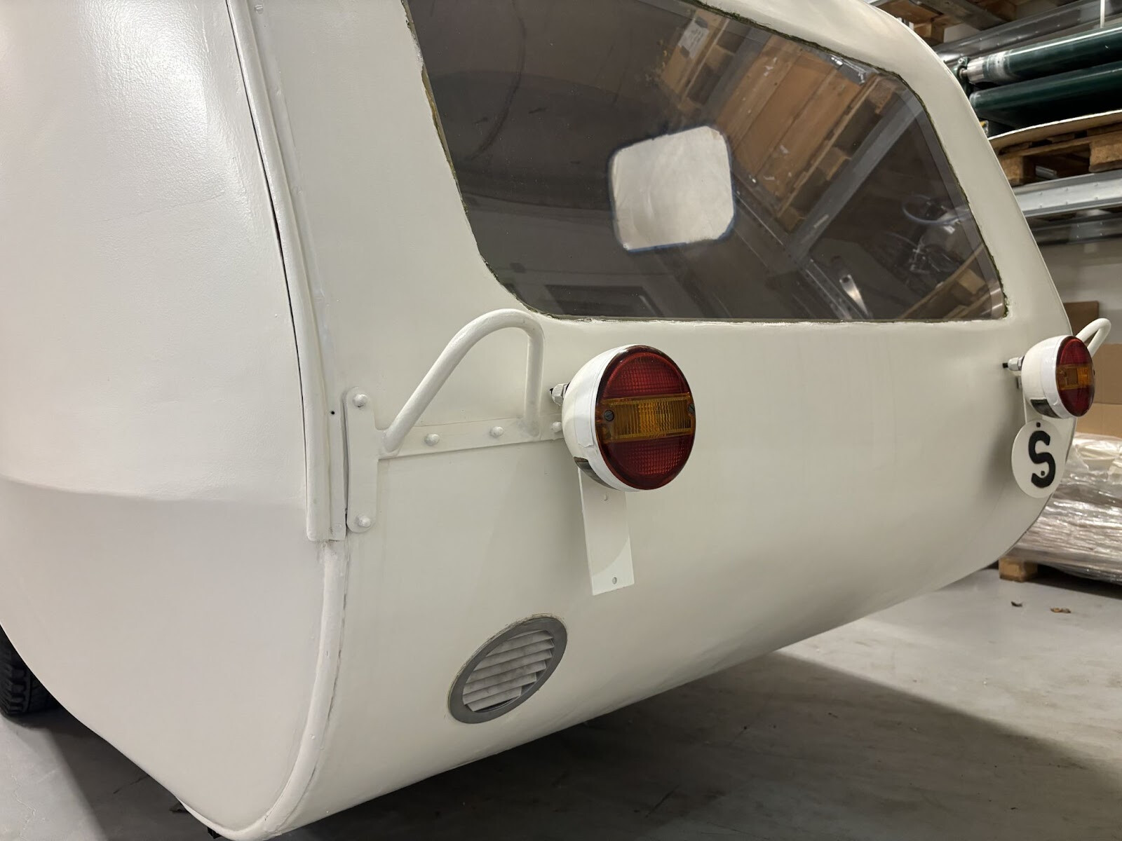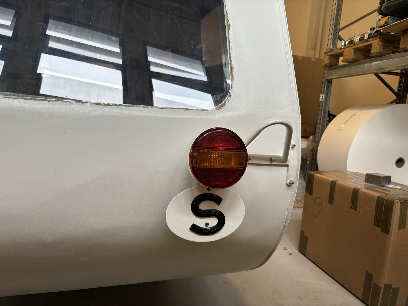 Två fyrkantrör svetsade jag fast under där cylindern kommer ligga. Det är inte helt självklart hur en sån här cylinder ska fästas. Den är ju också dubbelkrökt så den följer ju inte något som är rakt. Allt målades i alla fall färdigt så får jag klura ut resten sen. Jag skulle vilja bulta ner genom cylindern i dessa nya fyrkantrör. Men alla bultar skulle ha olika avstånd från cylinderytan till fyrkantrören. Det slutade med att jag bockade till bågar av överbliven aluminiumsplattstång från fönsterramarna. Jag kunde hyfsat enkelt få dem till rätt radie för olika positioner på cylindern så det var bara att komma på hur jag skulle individuellt låsa dem i rätt höjd. Jag funderade på om det skulle gå att mäta upp det på något sätt för att kunna printa ut små distanser. Kom inte på någon bra metod för det så jag gick på en mer handfast metod som innebar att fylla ut utrymmet mellan ramen och aluminiumbågen med något som skulle kunna härda till rätt form. Jag hade kvar en del glasfiberspackel som jag inte hade någon användning av nu när vagnen är målad. Visste inte om det skulle göra jobbet men värt ett försök i alla fall.