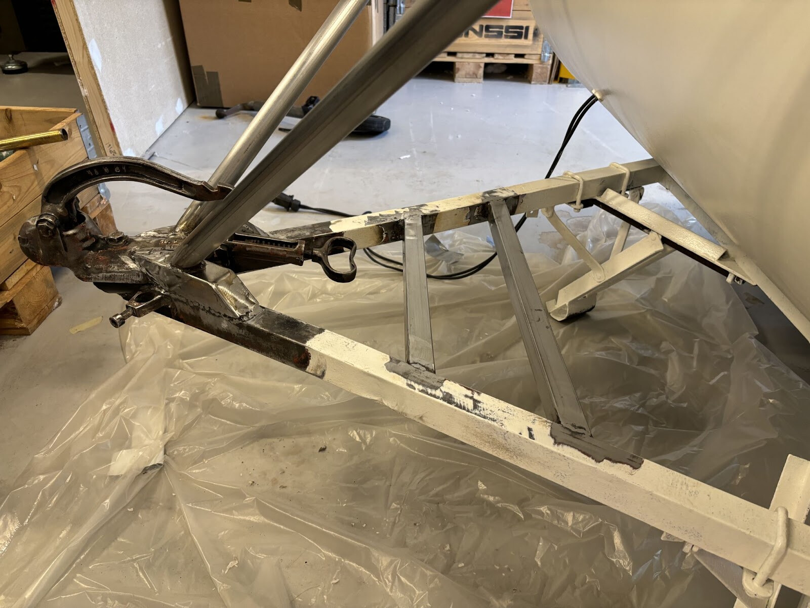 Men när jag testade med cylindern på plats och höll upp stagen insåg jag att de definitivt inte kunde vara svarta som vi hade målat dem tidigare. Det var en alldeles för stor kontrast med allt det vita.Bäst vore om hela underredet var vitmålat lika som vagnen. När det nu ändå var så mycket jobb nedplöjt i det här projektet skulle det extrajobbet det innebar bara vara marginellt. Jag skulle ändå behöva måla stagen och de nysvetsade delarna så varför inte allt synligt?