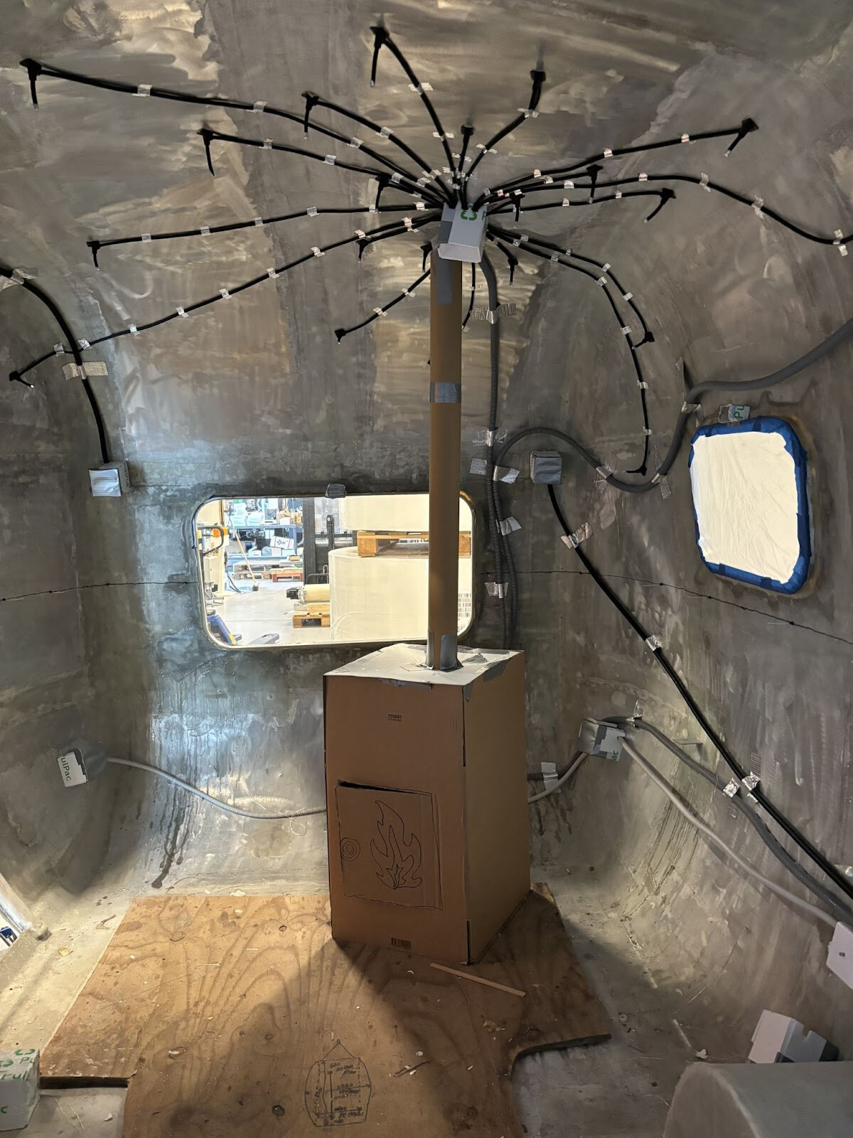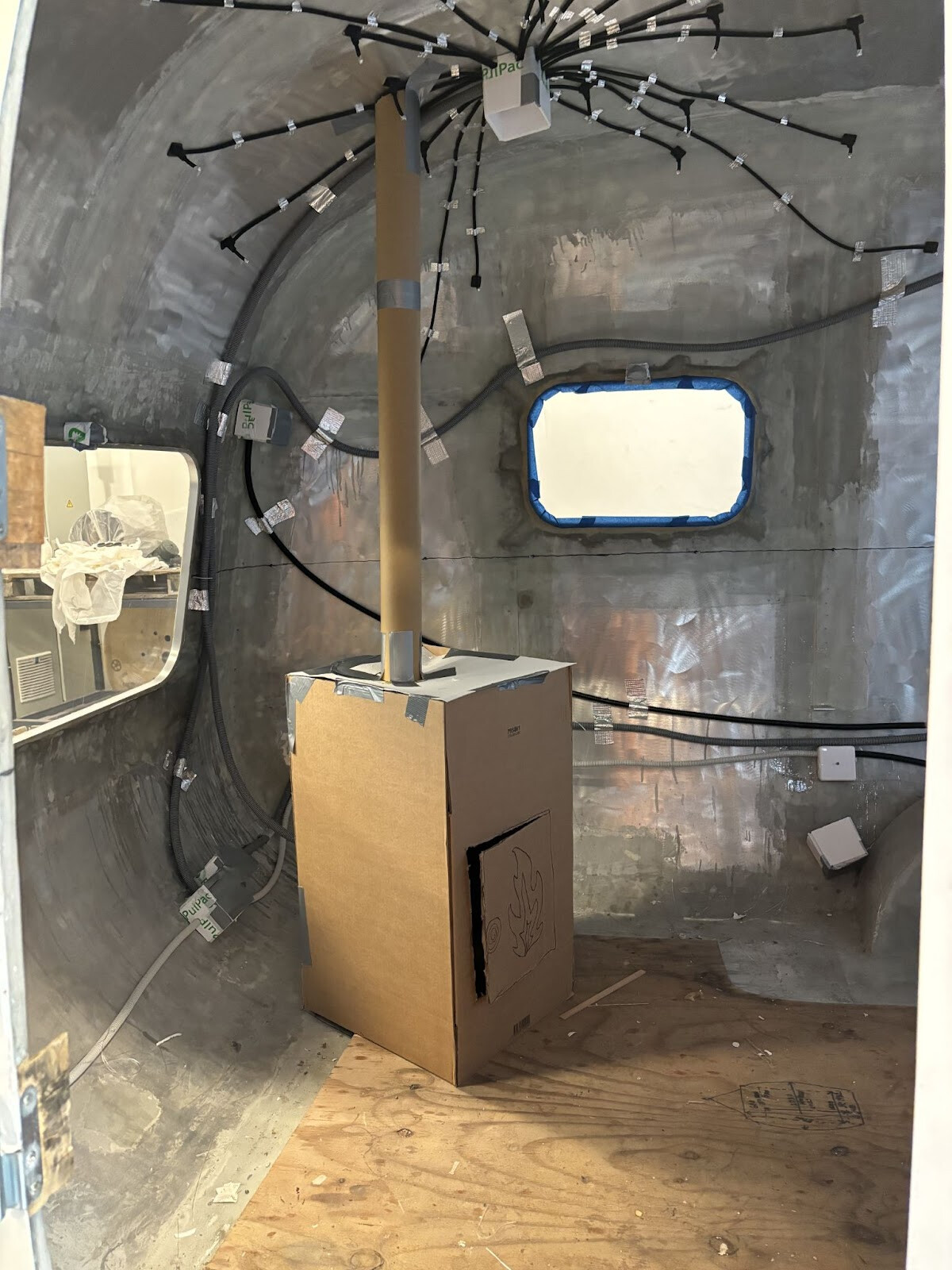 Skorstenspositionen måttades ut på ett ungefär och ett wellpappskydd sattes upp i taket för att inte få brännbart skum för nära rökröret.