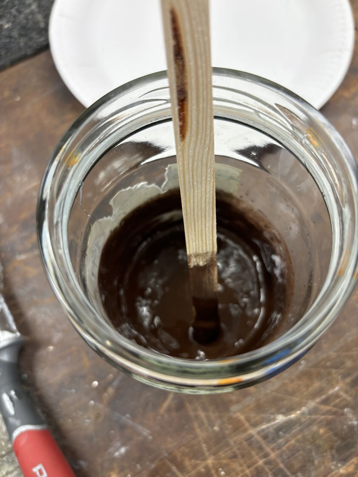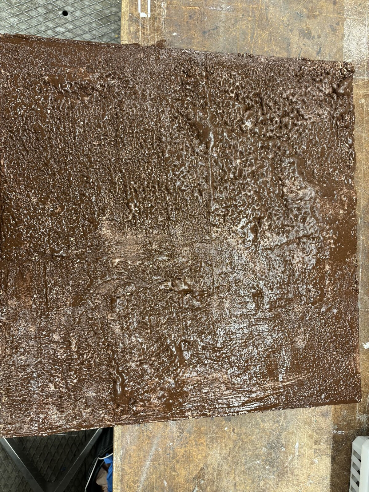 En tub silikon, järnoxidbrunt pigmentpulver och lite kemiskt ren bensin införskaffades för att göra ett test. För att ha så nära rätt grundmaterial som möjligt körde jag ett tunt lager fogskum på en plywoodskiva. Det är inte exakt samma typ som det stängda skummet jag planerade att använda men kemiskt lär det vara tillräckligt likt för ett rättvisande test.