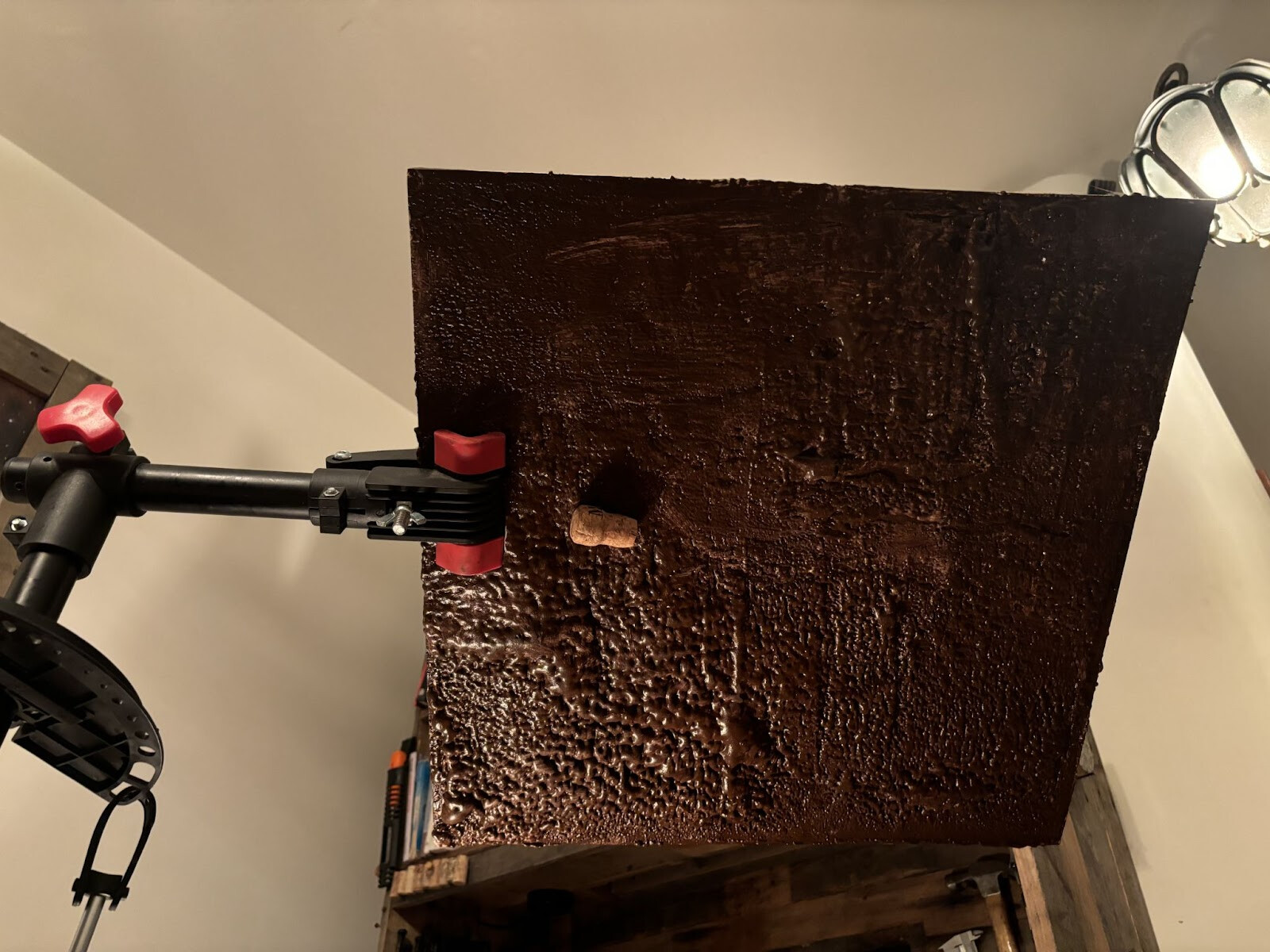 Nu var det ju viktigt att det gick att limma korkarna även upp och ner i taket så även det måste testas. Jag lånade ett cyckelmekställ av en granne och riggade upp skivan med den målade ytan nedåt.