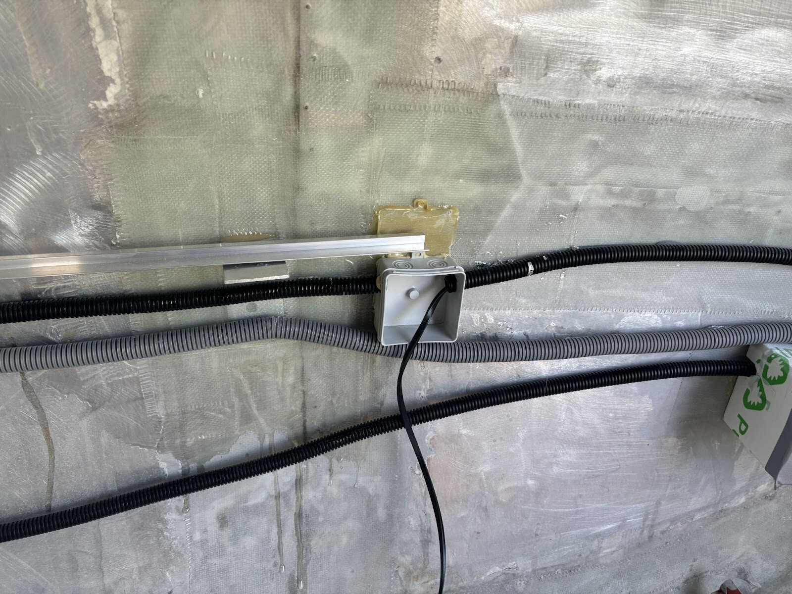 Efter ca fem minuter var skummet slut och då var det bara att gå ut, slänga av mig skyddsutrustningen och ta några djupa andetag frisk luft. Efter en stund vågade jag mig tillbaka för att inspektera hur det hade gått. Det var heltäckande men inte speciellt tjock på de flesta ställen. Jag hade tänkt att elslangarna skulle ligga helt dolda i skummet men så var inte fallet. De var i allra högsta grad synliga.