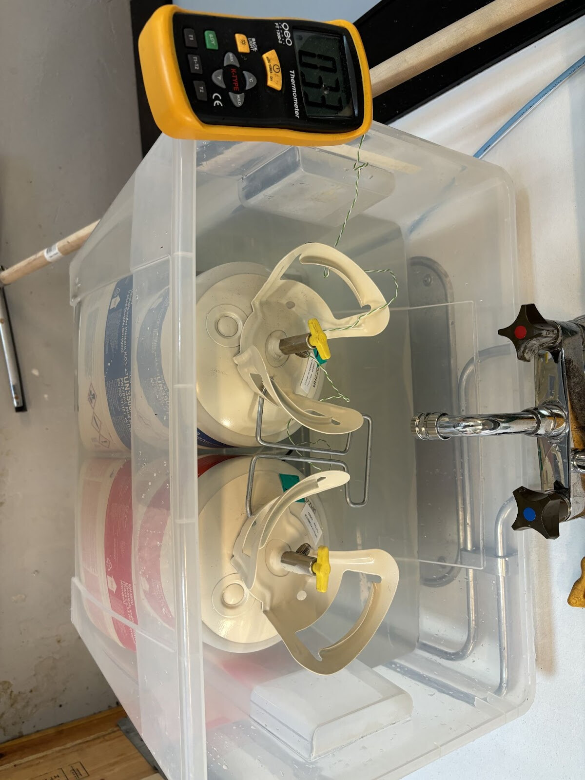 Jag hade köpt ett kit med Froth Pak 180. Det innehåller 180 liter färdigt skum vid optimala förhållanden, men folks erfarenheter var vad jag kunde läsa mig till, att det inte räckte alls så långt i verkligheten. Detta lilla kit kostade drygt 10ksek så jag var glad om jag skulle klara mig med det, nästa storlek uppåt är ett 600 literskit för drygt 20ksek. Smakar det så kostar det.. Jag tänkte att det egentligen räcker med ett väldigt tunt skikt, det viktiga är att jag lyckas sprida det över hela ytan. För att få ut maximalt av kittet så var det viktigt att det hölls vid rätt temperatur. Jag gjorde i ordning ett vattenbad som tankarna fick stå och värma sig i under ett antal timmar innan det var dags för operation skum.