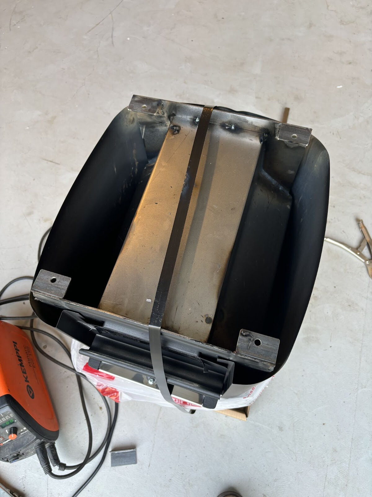 Invändigt tillverkade jag exakt likadana plåtbitar med rostfria vagnsbultar som jag hade gjort för handtagen baktill. Stagen svetsades och bultades mot dessa och sen hade jag påbörjat målningen när jag insåg att det bästa vore att svetsa till lite extra delar för att montera cylindern på, ett batteripack kan ju väga en hel del och det behöver en stadig grund att stå på..
