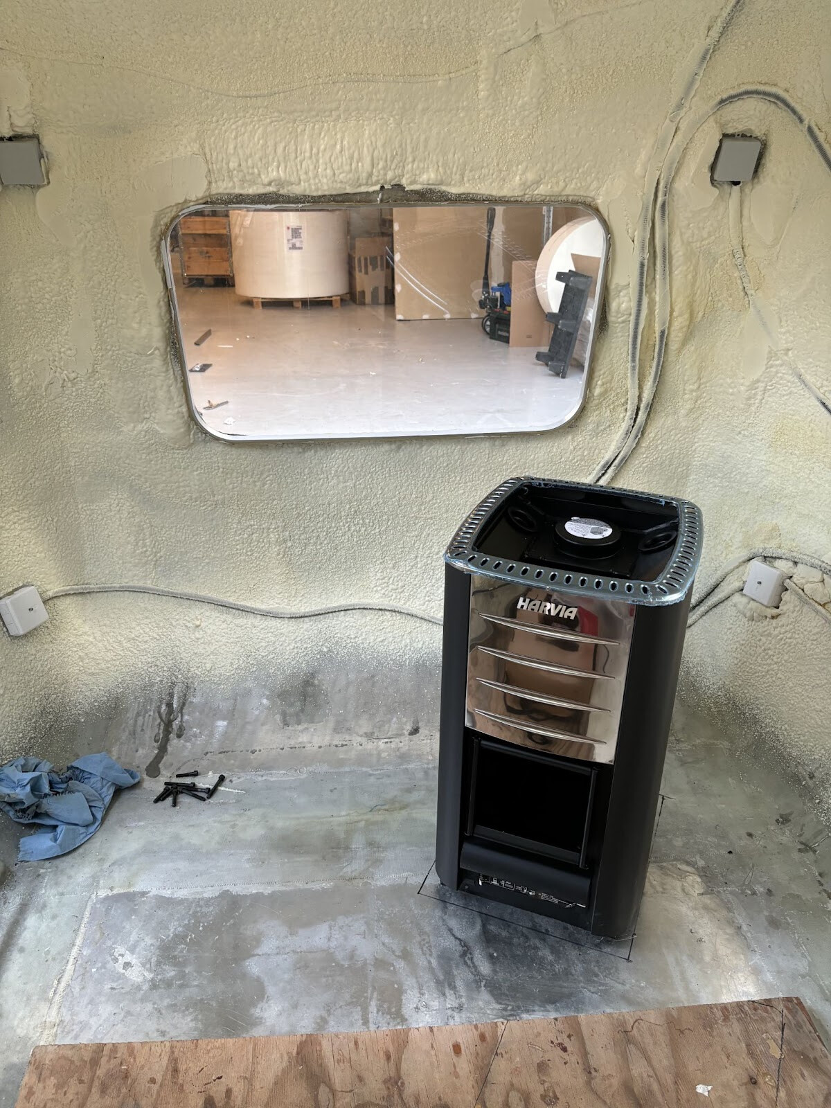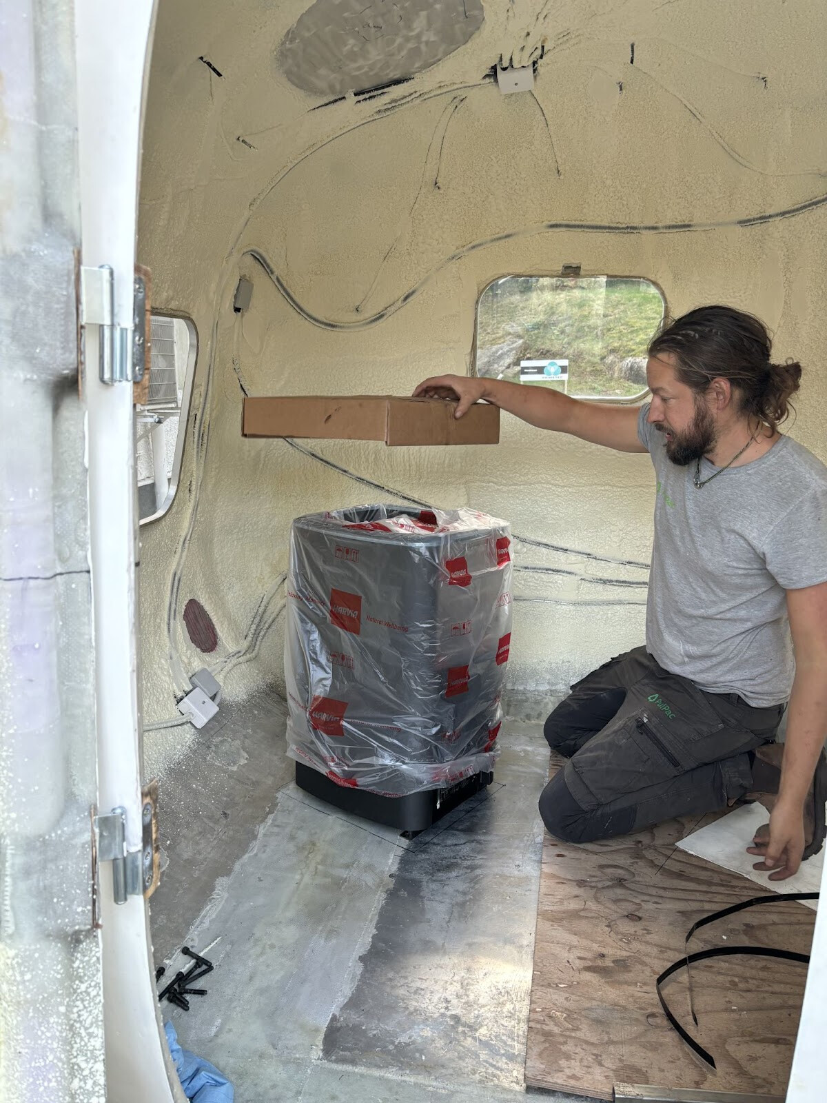 Under hela projektets gång har tankarna på bastuaggregat legat och grott. Självklart skulle det vara vedeldat då det mest kommer att användas ute i naturen på fina platser. Ett tag var jag inne på att designa ett kombiaggregat som dels kunde drivas med ved men också med gasol för de gångerna man bara vill basta och inte mecka med allt vad vedeldning innebär. I så fall skulle det också vara möjligt att använda även i tätbebyggda områden där annars vedrök skulle kunna vara ett problem. Jag var inne på att bygga eldstaden och rökrör i rostfritt och allt annat i aluminium för att komma ner i vikt. Men att designa, och bygga ett bra och säkert bastuaggregat skulle förlänga hela projektet en bra stund. Det fanns redan vid den här tiden många vänner och bekanta som tyckt att projektet aldrig verkar ta slut (vi själva också ibland 😛) så för att inte ge dem mer vatten på sin kvarn så valde vi bort detta alternativ - för stunden i alla fall. Kanske kommer vi att vilja uppdatera aggregatet i framtiden men nu vill vi börja basta inom en överskådlig tid så vi bestämde oss för att gå på ett vanligt aggregat till att börja med. Ett harvia M2/M3 är det lättaste färdiga aggregatet jag kunde hitta. Traditionellt är inte bastuaggregat designade för att vara lätta tyvärr.Hur aggregatet skulle placeras var också ett viktigt beslut. Det måste dessutom tas innan isoleringen kommer på i och med att man gärna vill undvika att isolera där skorstenen ska ut. Aggregatet väger 45kg utan stenar så det är enskilt det absolut tyngsta i vagnen. Som ni kanske minns så hade vi förstärkt underredet där vi i början hade tänkt att vi skulle ha aggregatet. Det var så här i efterhand helt ogenomtänkt då vi bara hade gjort det utifrån ett bastuperspektiv, inte med tanke på att vagnen skulle vara körbar med det i. Optimalt för balansen och körbarhet vore att placera aggregatet i mitten, precis på hjulaxeln. Detta vore inte bra ur ett bastuperspektiv dock. Skulle aggregatet stå längre bak skulle det bidra till ett negativt kultryck vilket påverkar köregenskaperna väldigt negativt och det kan till och med vara farligt att köra med det. Placeras det längre fram blir det ett positivt kultryck vilket kan vara lite störande med sämre grepp på dragfordonets framhjul men vagnen kommer inte börja vobbla och bli livsfarlig. Så då faller valet så klart på det senare. Vikten bör också vara så centrerad det går från höger till vänster. För att känna efter hur det skulle kännas för bastubarheten byggde jag en enkel wellpappmodell som vi kunde flytta runt.