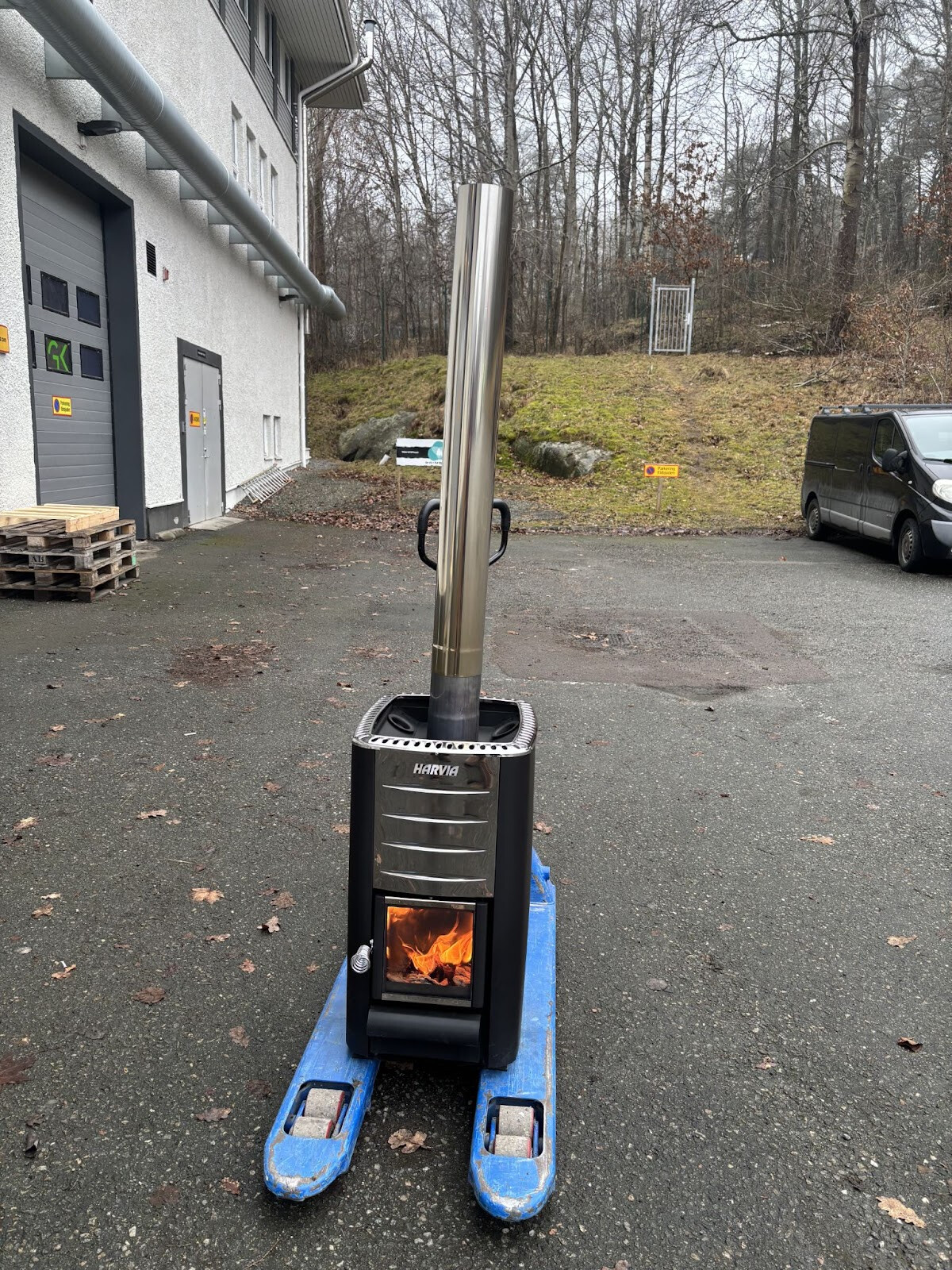 Vi plockade ut aggregatet ur vagnen igen och ställde det på en palldragare ute på parkeringen. En liten brasa tändes och även om det stank av bränd målarfärg över parkeringen så gav det oss en liten försmak på vårt första bastubad som vi vid det här läget såg komma allt närmare.