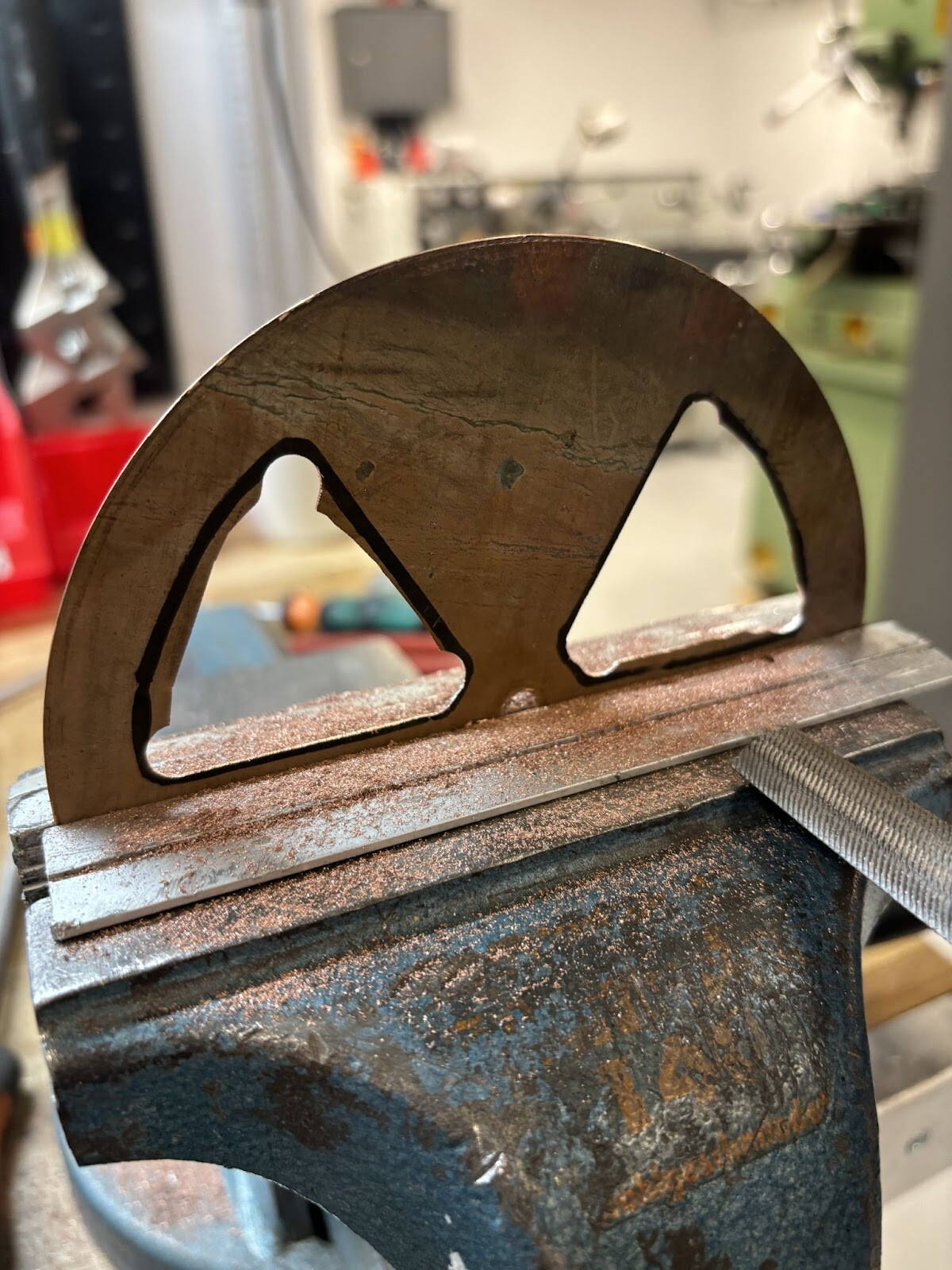 Jag hade några bitar stuprör i koppar liggande, överblivet från tidigare inredningsprojekt. Jag klippte upp och plattade ut det tillbaka till plåt, gillar återvinning och att delar i projektet har en egen historia. Jag printade ut en mall som gjorde det lätt att överföra modellen till plåten