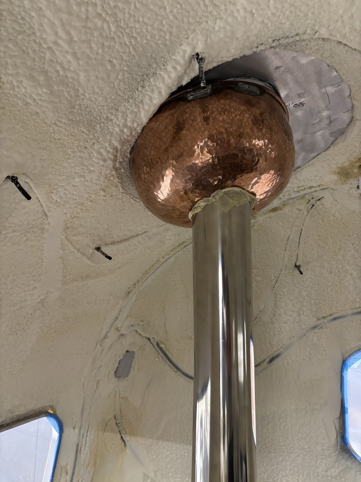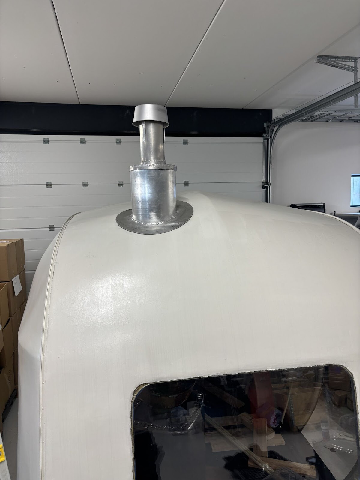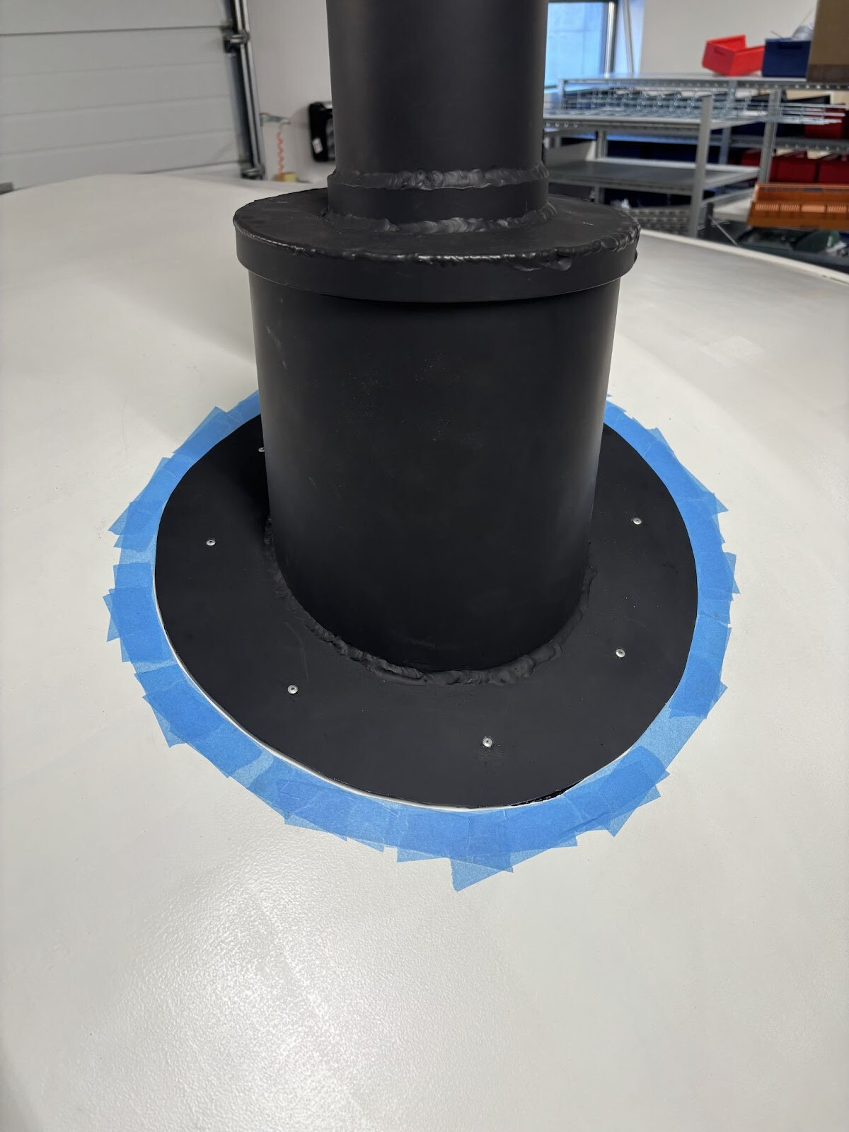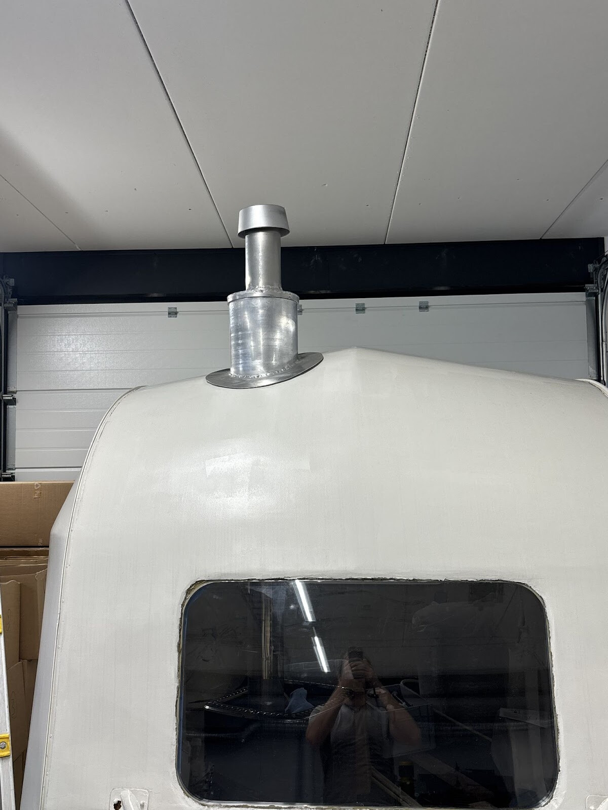 Hela den fint polerade bunken blev helt missfärgad av oxidation efter lödningen så det var bara att börja om att putsa oxider och polera. Tre motsvarande fästen byggdes av rostfria plåtbitar med var sin skruv lödd på mitten. Dessa limmades upp runt hålet i taket och plastades sedan fast. Ett rikligt lager högtemperatursilikon smetades ut under kragen, aka hattbrättet, och det monterades också på plats med vattentäta popnitar. Lite maskering och ytterligare lite svart silikon så började det bli ganska klart.