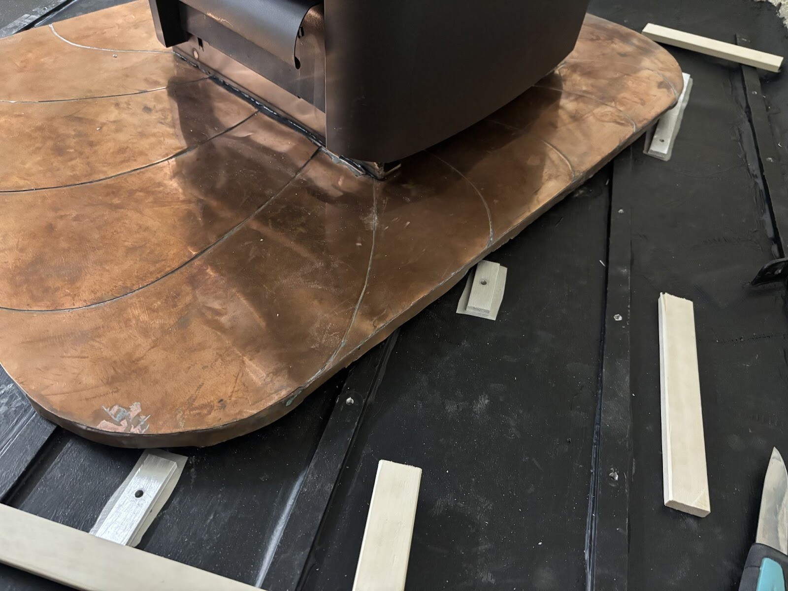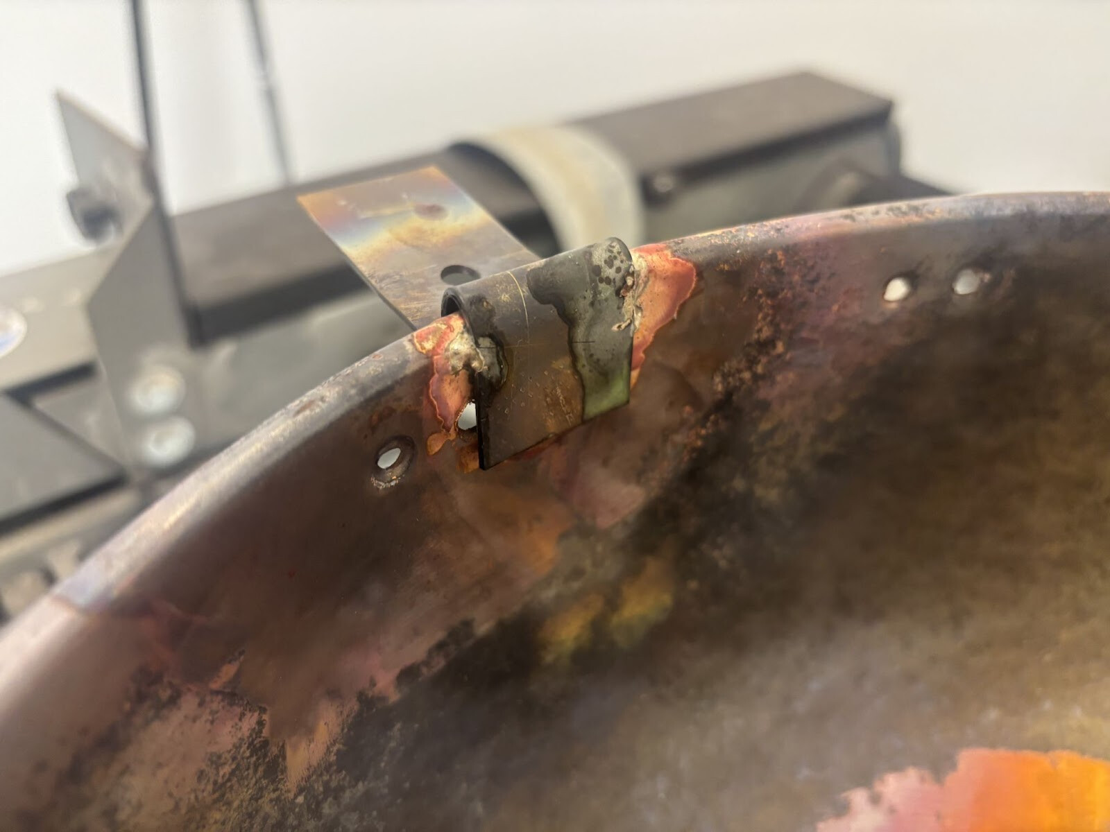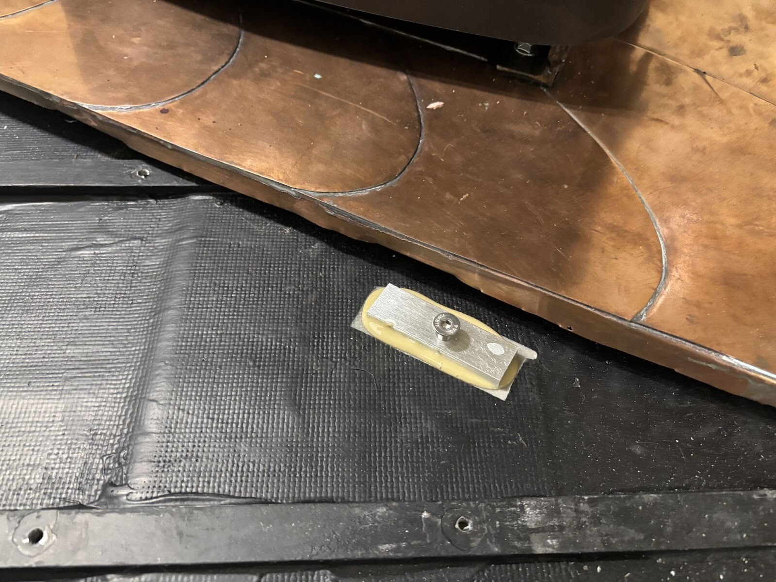 Innan den kunde fästas och tätas med silikon var det dags att göra lite fästpunkter till kopparbunken. Jag bockade till tre små bitar rostfri plåt att hålla över kanten, dessa löddes fast med silverlod. Inte vackert detta heller men det kommer ju att döljas under korkarna sen när den är slutmonterad.