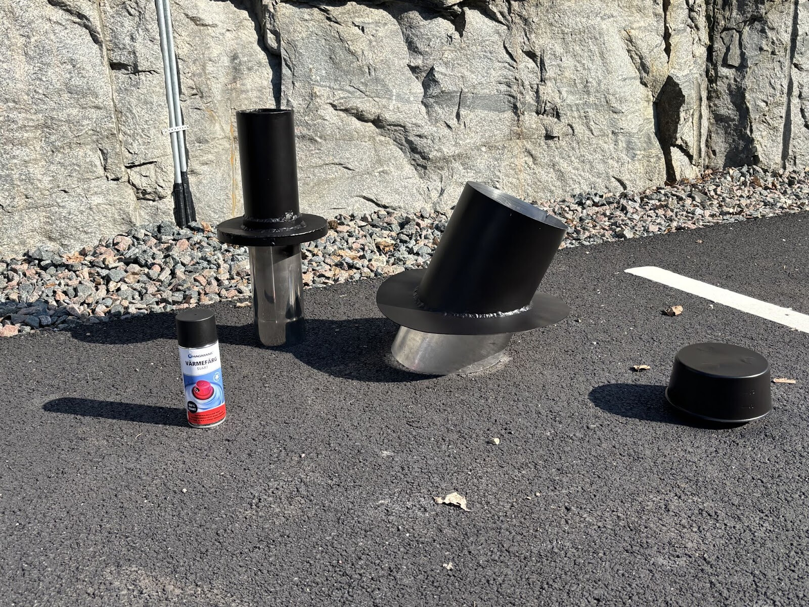 Även det smala aluniniumröret kapades till längd, 10 mm längre än det inre rostfria röret och de extra millimetrarna böjdes in över kanten. Nu fanns det ingen risk alls för att vatten skulle kunna ta sig in i isoleringslagret. Men det skulle fortfarande kunna regna rakt ner i skorstenen in i kaminen och det skulle ju heller inte vara bra om den rostade bort inifrån. En regnhuv skulle behövas över skorstenen som släpper ut röken fritt men hindrar vatten, snö och is att ta sig in.