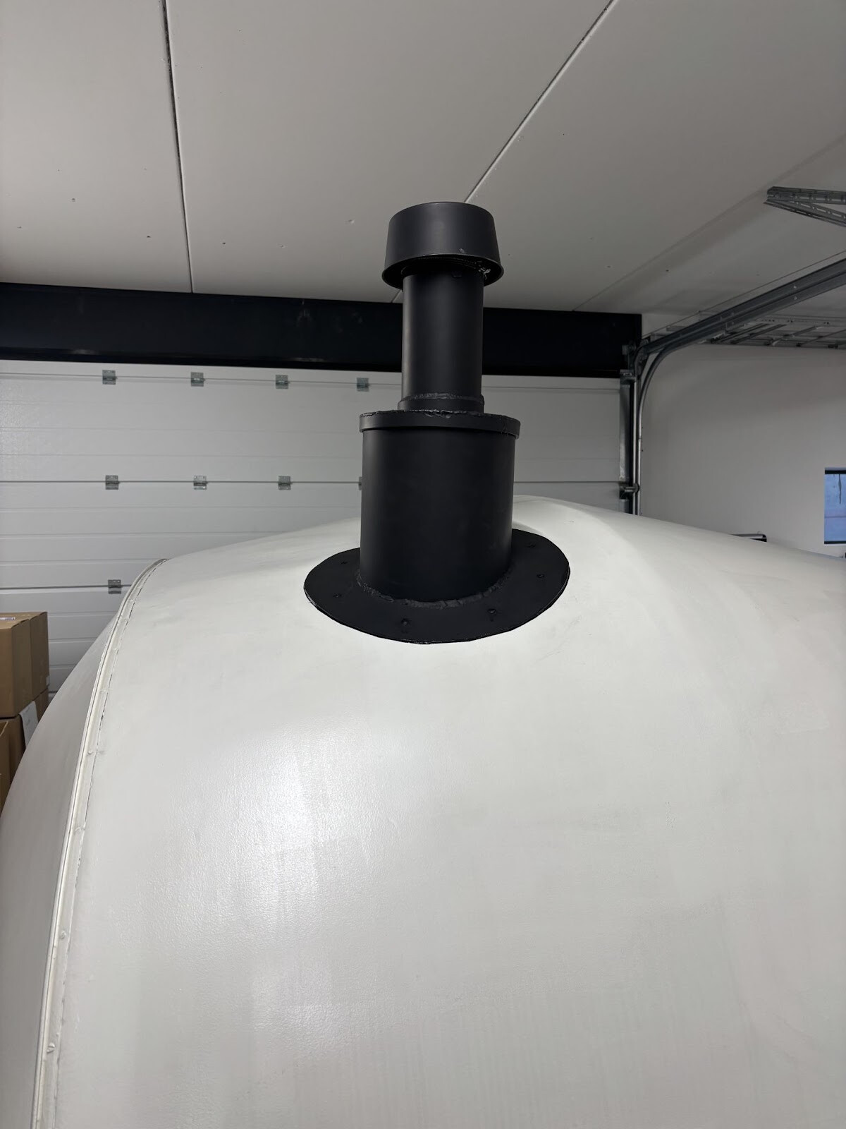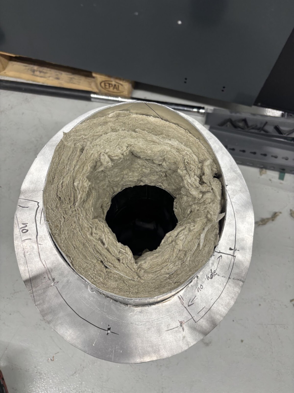 Invändigt var det sen bara fylla med brandisolering och montera dit bunken. Jag använde mig av två lager 30mm brandmatta, totalt 60mm alltså för den delen som är i röret. Bunken är också fylld med isolering så där är det betydligt mer..