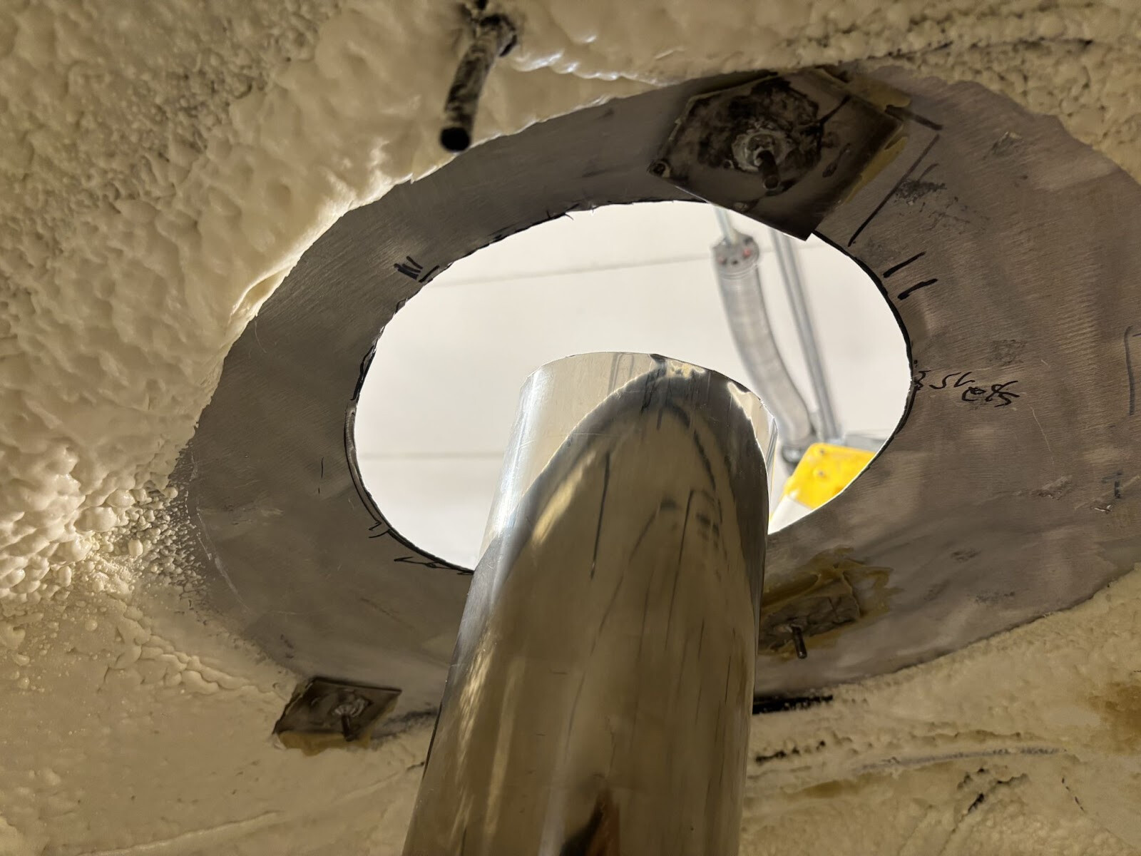 I bunken togs det upp ett hål för röret, det var tvunget att vara lite avlångt i och med att taket lutade där den skulle sitta. För att inte isoleringen ska komma ut i springan mellan bunken och rökröret var denna tvungen att hållas minimal. Det blev således många iterationer där jag tog bort minimalt med material varje gång och satte upp och testade passformen.