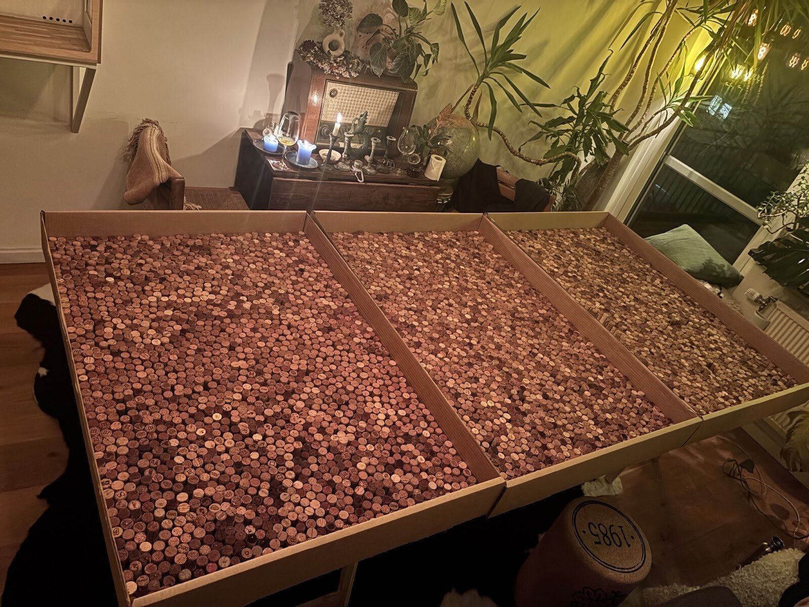 De flesta korkar har vi sorterat i fyra olika kategorier i samband med att vi lagt upp dem i vindsförrådet: rödvinskork, vitvins- och ölkork, champagne-/bubbelkork samt övrig kork. Jag separerar ut all rödvinskork först och främst för att kunna utnyttja de röda delarna i designen, att använda den liggandes vore ett stort slöseri. Nu när det ändå börjar kännas som att korkuppsättningen närmar sig tänkte vi att det vore bra att göra en första sortering. Det viktigaste och så klart roligaste är att sortera rödvinskork. Jag införskaffade tre stora wellpapplådor á 0.96m2 och pallade upp dessa på pallbockar i vardagsrummet.