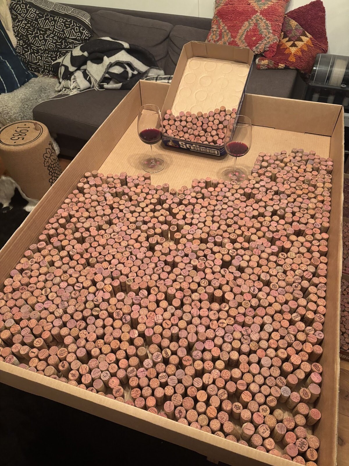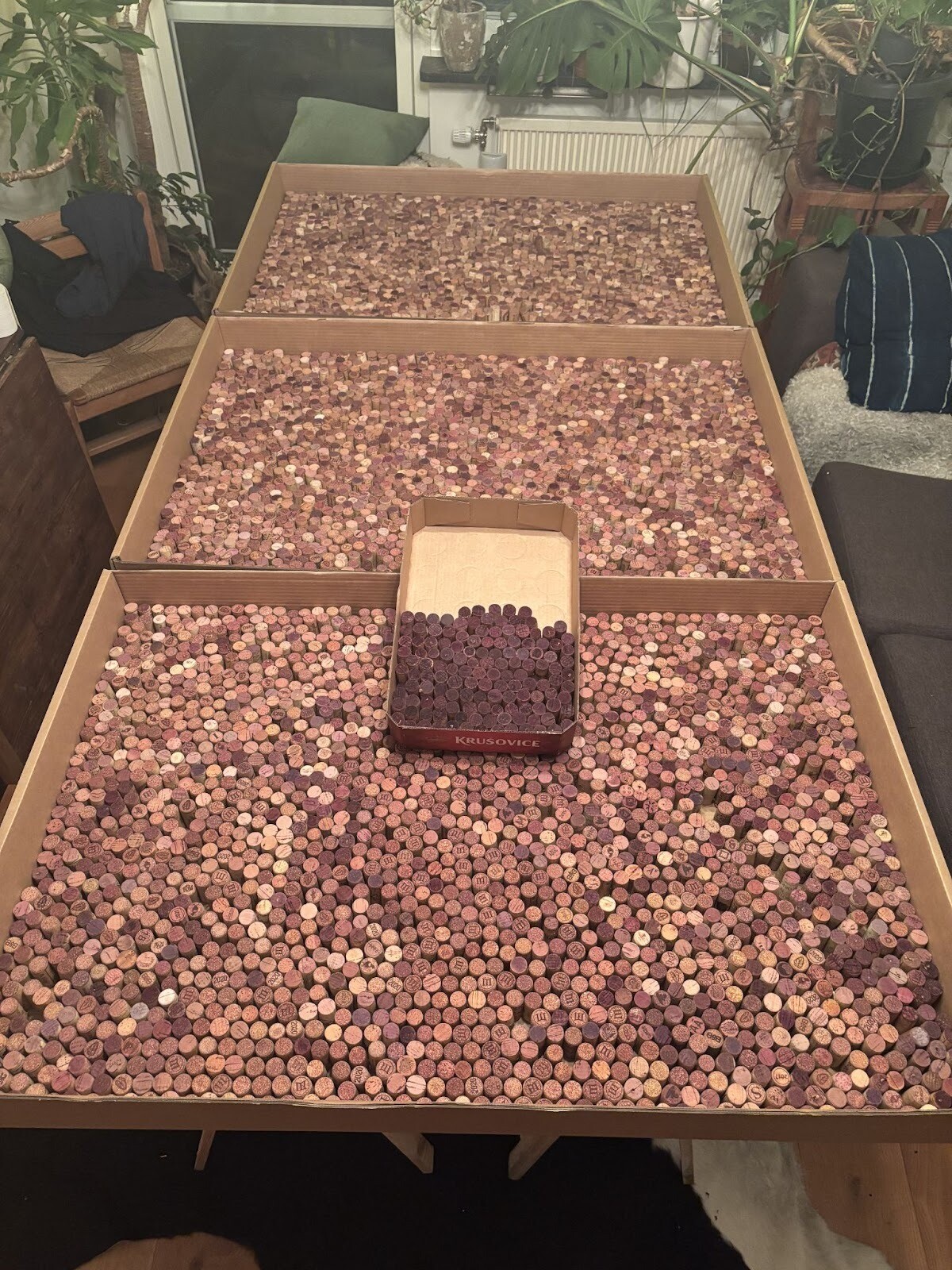 Som ni nog anat vid det här laget så kommer det att gå åt en hel del kork. Insamlande har fortsatt sen jag jobbade med sovrumsväggen i lägenheten. Många vänner, bekanta, släktingar, kollegor och diverse näringsidkare har bidragit och vi börjar komma upp i en bra samling vid det här laget. Vi har konsumerat en och annan flaska själva under åren också. När jag fyllde 40 för ett par år sedan arrangerade vi en stor tvådagarsfest/festival där valutan var kork. Alla köpte öl, drinkar och mat med korkar. 😄Det enda jag önskade mig i present var kork och man kan väl säga att många gick all in så denna tillställning var det enskilt största insamlingseventet vi gjort. Vi har också varit i Portugal på korkresa där vi både fick se korkekar, dricka vin och samla kork.