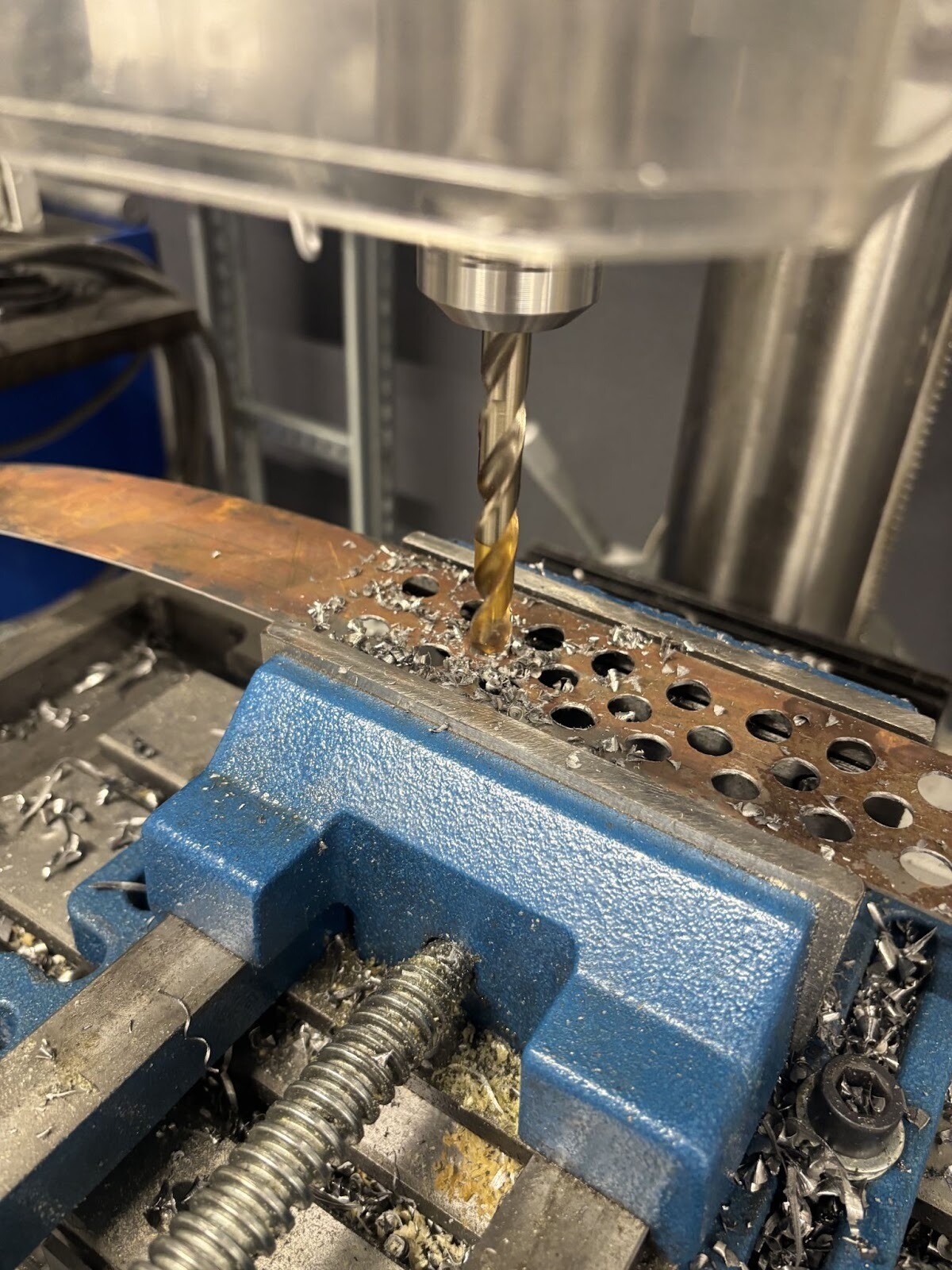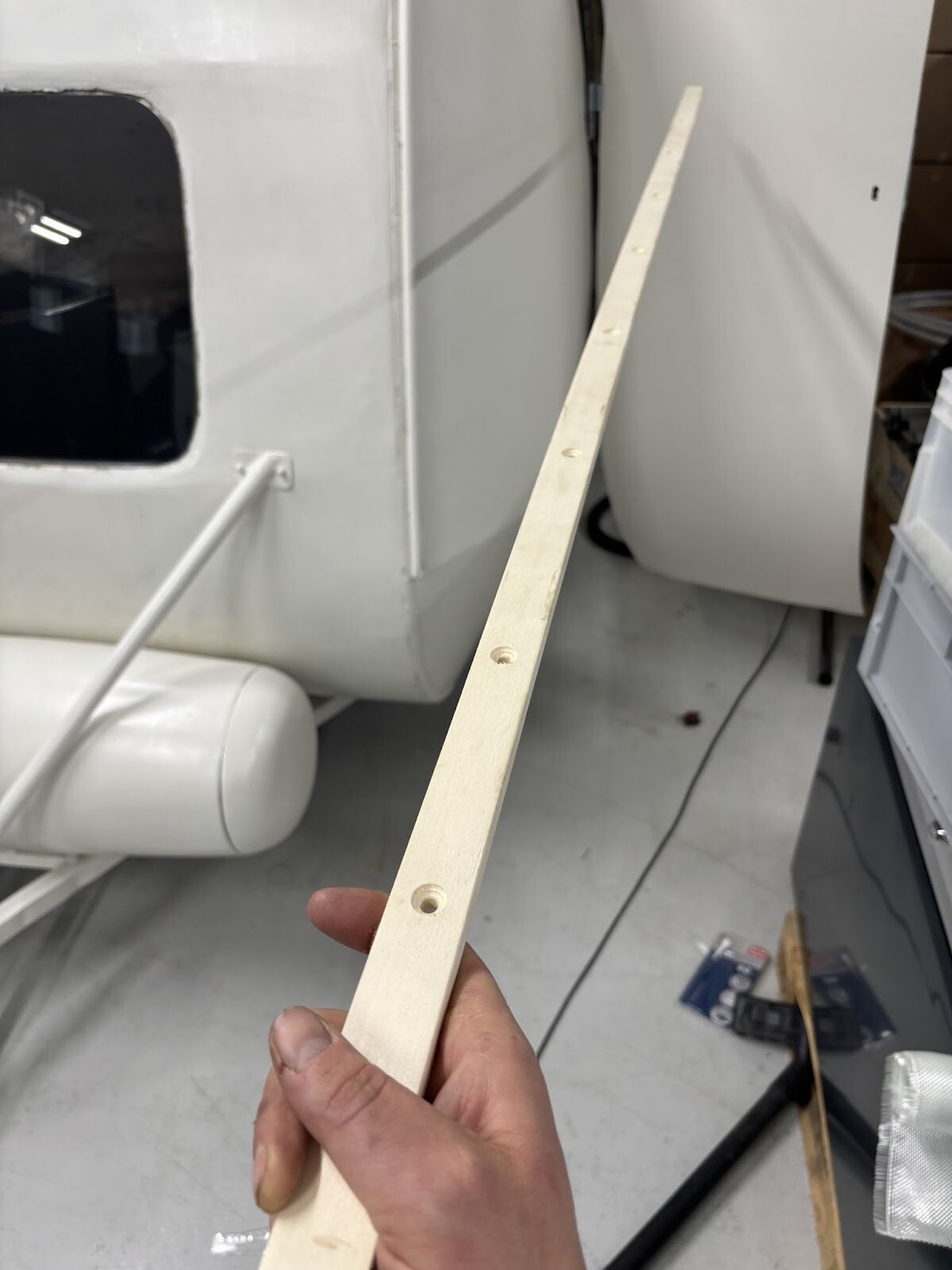 De hjälper till att styra ribban på plats och få skruven så centrerad som möjligt på den. Alla kan självklart inte bli perfekt centrerade om alla skruvar inte ligger helt i linje men med hjälp av dem kunde felet minimeras i alla fall. Ett lätt tryck på ribban så hade den små markeringar för varje skruvposition. Dessa borrades med 6 mm träborr och sen försänktes de från andra sidan. Det fungerade helt perfekt! 16mm rostfri försänkt m6 skruv passade i vartenda hål.