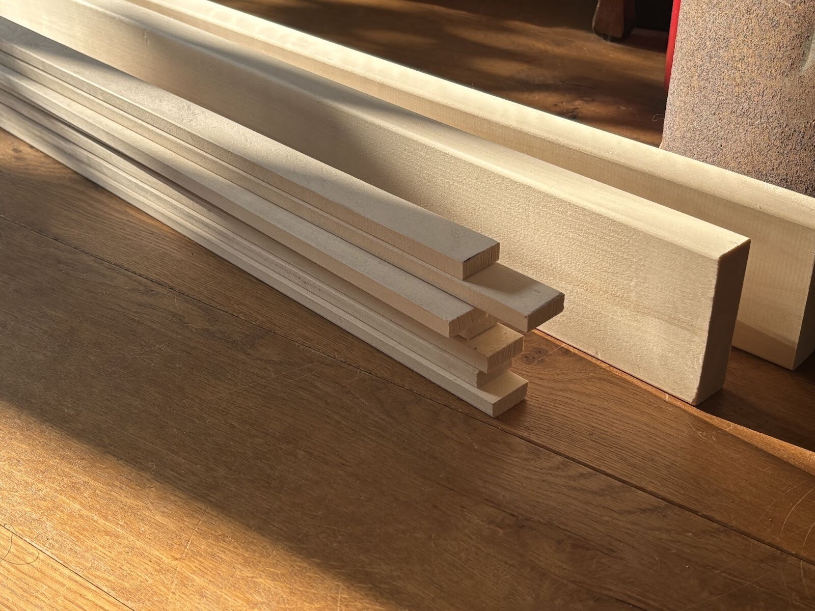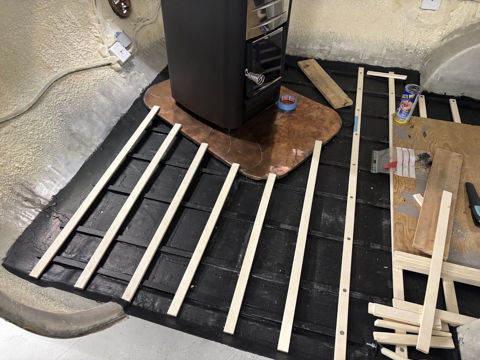 På plats i husvagnen var det dags att ge oss på andra lagret av golvet, de tvärgående ribborna. Vi hade inte helt valt vilken typ av trä vi tänkte oss invändigt men det lutade åt asp. Så lika bra att göra även dessa ribbor av asp även om de inte kommer vara synliga under golvet.En källa för bra asp är ju färdiga bastulavar. Visserligen väldigt dyrt men då det är väldigt små mängder vi behöver blir det inte så mycket ändå. Fördelen med dem är att de är raka, kvistfria och planhyvlade. Det är ett lockande alternativ då jag inte har tillgång till någon träverkstad med maskiner för närvarande. Lavarna jag fick tag på var 28x90 mm så med en klingbredd på 3 mm kunde jag få ut 7 ribbor av varje med dimensionen 28x10mm. De klyvdes och sen gick jag över dem med sandpapper för att få en lite finare yta att jobba med.