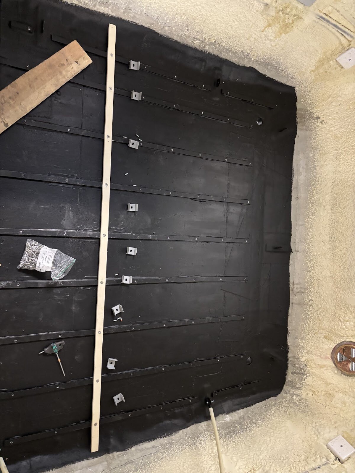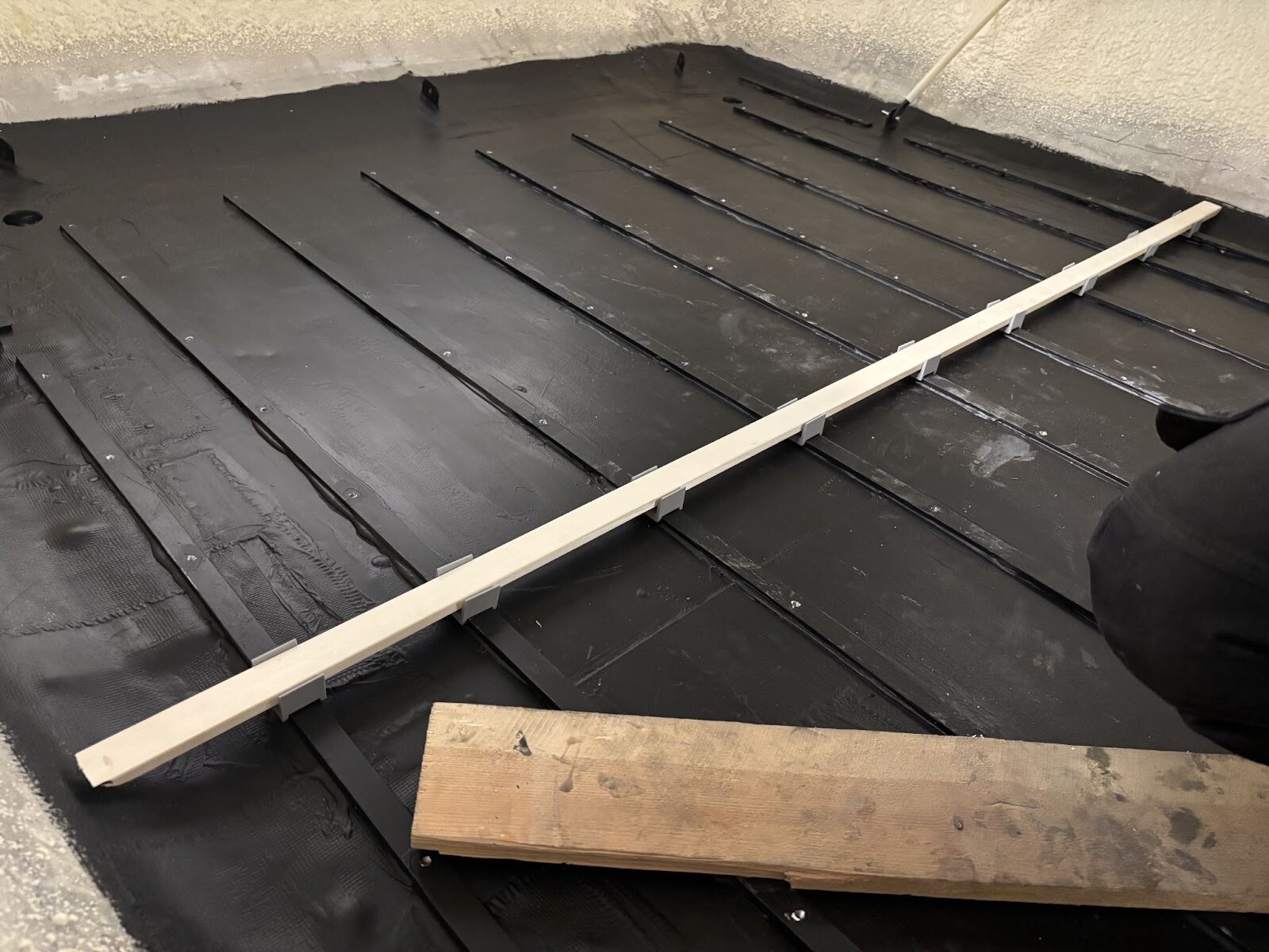 Till slut var alla “enkla” bitarna på plats och då återstod de runt aggregatet. Då ribborna är så pass klena kan de inte ha mycket utstick alls som är osupportat. Runt aggregatet skulle det dock bli vissa som hade längre utstick än önskvärt så jag insåg att det skulle behövas lite fler supportpunkter i form av aluminiumbitar. Och då är det lika bra att gänga dessa också. De placerades ut där de behövdes och markerades Sen bar det mig väldigt mycket emot men jag var tvungen att skära genom gummimembranet och pilla bort det där bitarna skulle limmas.