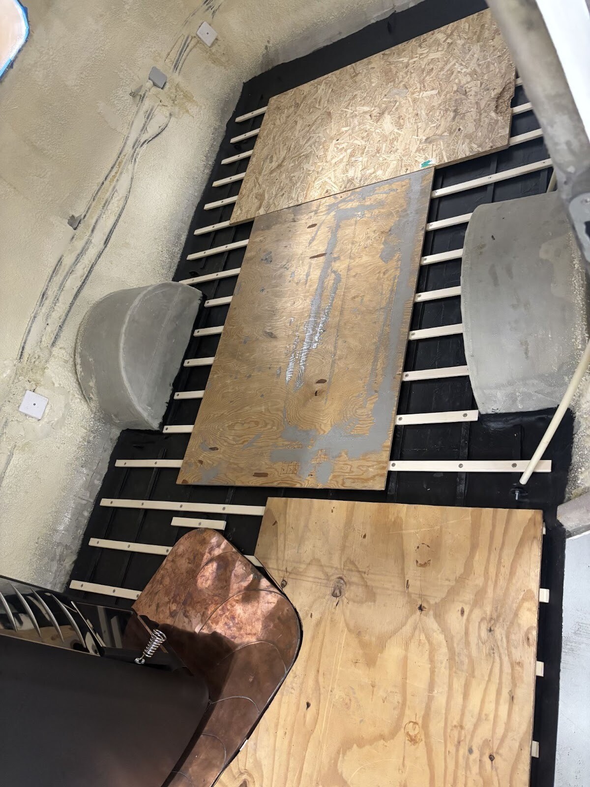 Äntligen är hela andra lagret av golvet klart! Nästa steg med golvet blir att lägga trall men det är mycket kvar innan dess. Vill ju inte ha ett fint golv klart och sen behöva skydda det från droppande färg och silikon när korkarna ska limmas. Därför la vi bara in några gamla emballageskivor att gå på som vi inte behövde vara så rädda om.