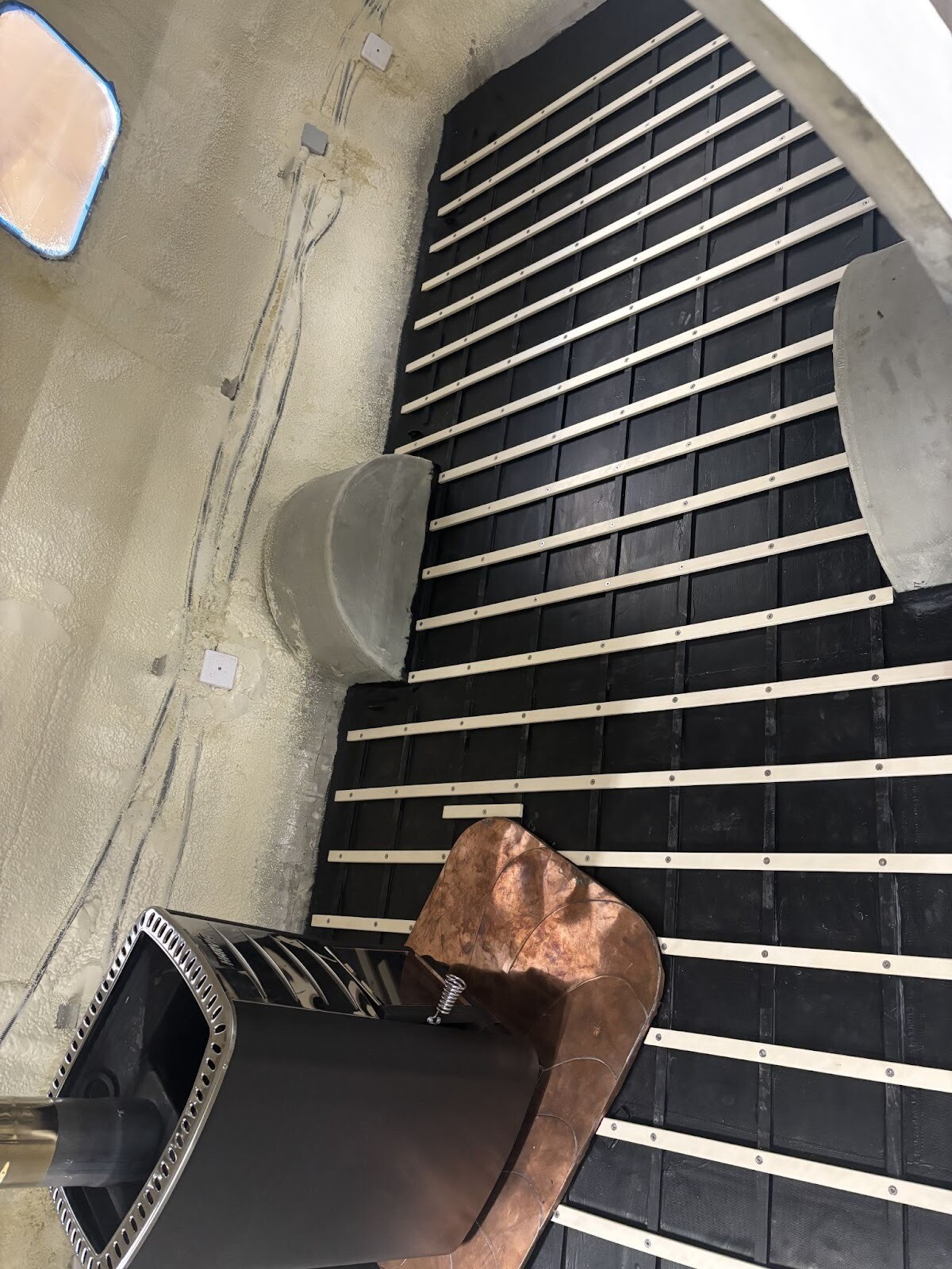 Har ni funderat något på ohälsosamma emissioner av den här silikon-kork-lösningen som ni smetar på väggen? Man börjar ju fundera när man ser dig i skyddsmask och tänker på att man ska sitta näck i det här utrymmet och njuta senare.