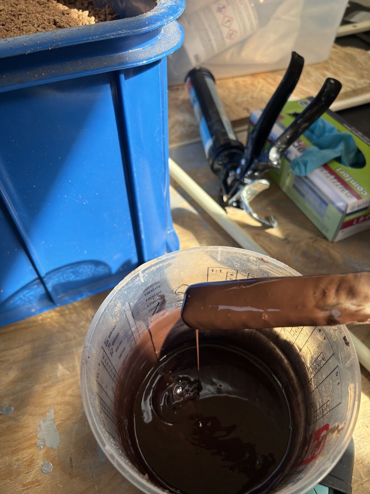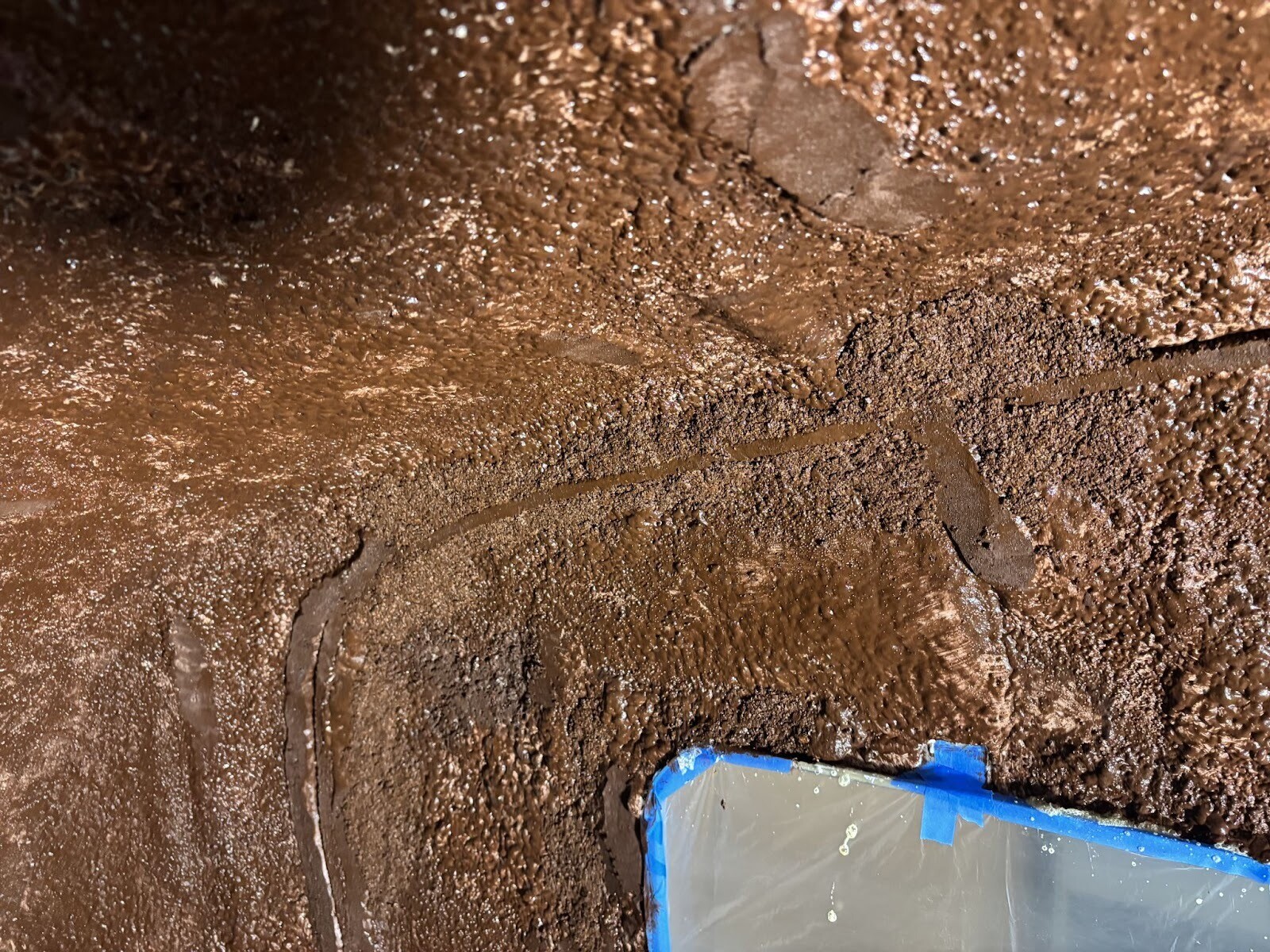 Det kändes som ett lyckat test trots svårigheten att applicera det, insikten var att detta skulle bli väldigt svårt att jämnt täcka alla väggar så här men det är ju faktiskt inte nödvändigt. Stora delar av väggarna är tillräckligt jämna och det är bara där det är som mest ojämnt som detta behövs. Framförallt runt eldosor och slangar. Så för att gå vidare var nästa steg att måla en silikonhinna över allt skum. Denna var lika bra att pigmentera direkt. Dels så skulle den vara mycket lättare att måla då den skulle synas och dels så skulle den direkt ge den bruna bakgrunden jag var ute efter på de ytor som inte skulle täckas med korkmassan.
