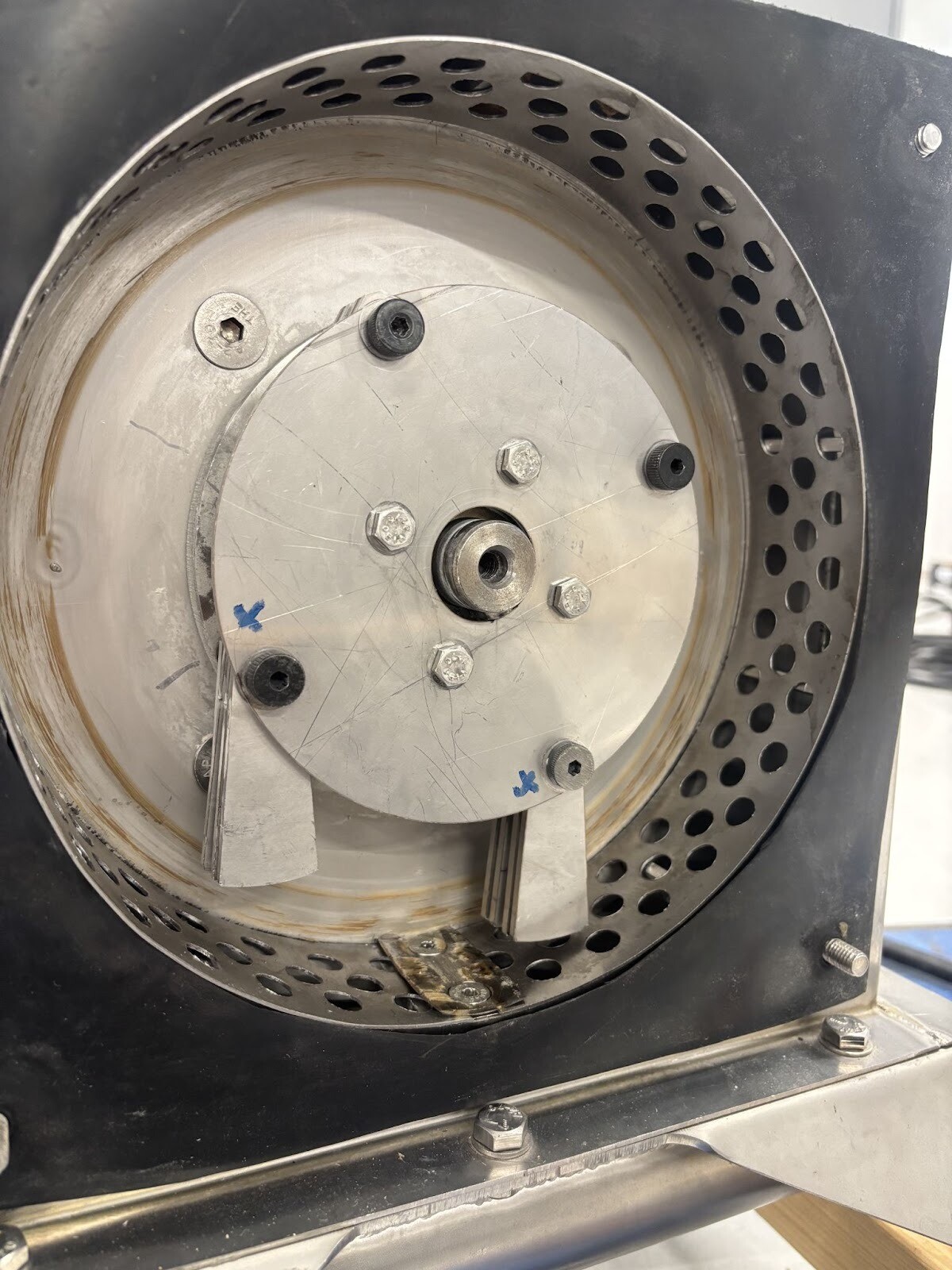 Nästa steg var att hitta rätt proportioner kork till silikon. Jag vill ju inte ha mer silikon än nödvändigt då det innebär onödig vikt men vill heller inte ha för lite silikon så att det blir för poröst och väggarna riskerar att gå sönder. För att göra dessa tester och sedan också det slutliga ”spacklet” var det ohållbart att mala korken för hand. Jag letade fram en gammal hammarkvarn som borde göra jobbet. Den saknade dock ett såll så jag klippte till en plåtremsa och satte upp den i pelarborren. För att minimera silikonåtgången resonerade jag att det vore bäst att ha relativt grovmald kork. Då blir ytarean av granulatet mindre och då bör det teoretiskt gå åt mindre mängd silikon för att täcka den. Korken fick heller inte bli för grovmald då det skulle bli svårt att sprida ut jämnt på väggarna. En hammarkvarn funkar så att det är plåtbitar, sk hammare, som sitter på en rotor som roterar i ett utrymme omgärdat av en hålplåt. Materialet tumlar runt och slås i bitar tills det är fint nog att passera ut genom hålen. Detta är en väldigt vanlig typ av kvarn som används till allt från spannmål och pappersmassa till mineraler och elektronikskrot. Malningsgraden i en hammarkvarn är så klart direkt beroende av sållets hålstorlek men det sätter bara den övre gränsen på partikelstorleken. Majoriteten av bitarna kommer ut mycket mindre än så. Jag valde med detta i åtanke att tillverka ett såll med 12 mm hålstorlek.