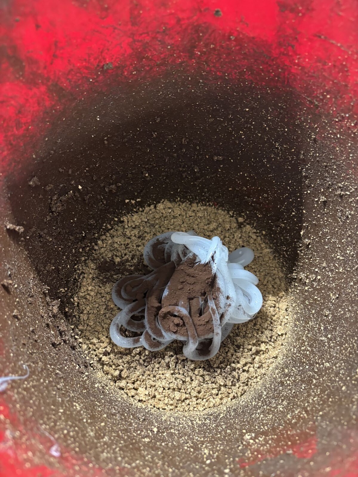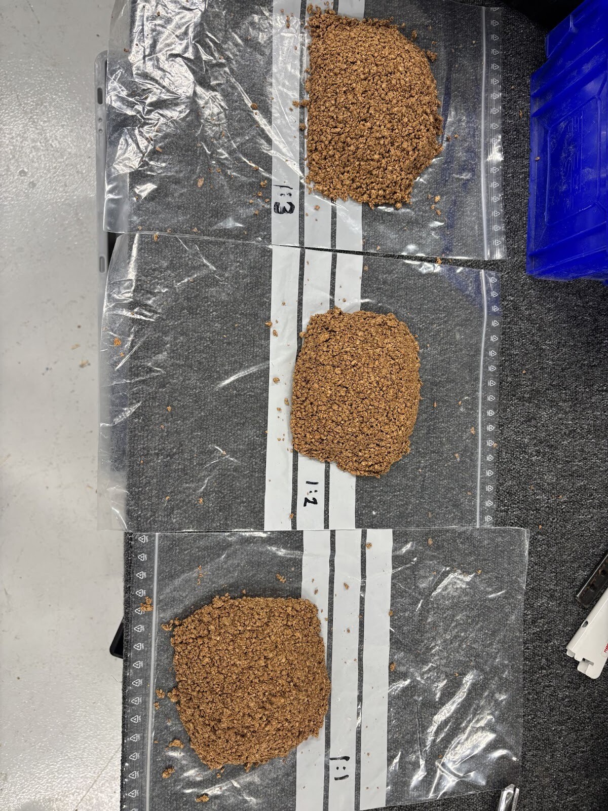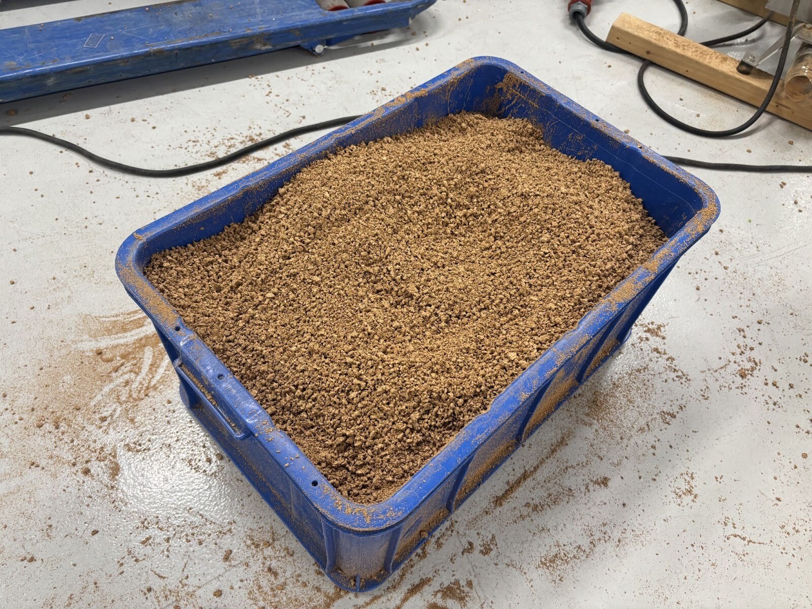 Detta testades och det gav ganska precis den malningsgrad jag var ute efter. För att komma fram till rätt mängd silikon för detta granulat gjorde jag en liten testserie, 3:1, 2:1 och 1:1 kork till silikon i vikt. När de härdat var det tydligt att endast 1:1 var tillräckligt solid för att kunna fungera som väggbeklädnad. 3:1 föll sönder i individuella granuler direkt, 2:1 höll ihop men var ganska lätt att smula sönder medan 1:1 kändes hyfsat solid. Vi malde en låda kork som blev ca 30-40 liter korksmulor till att börja med.