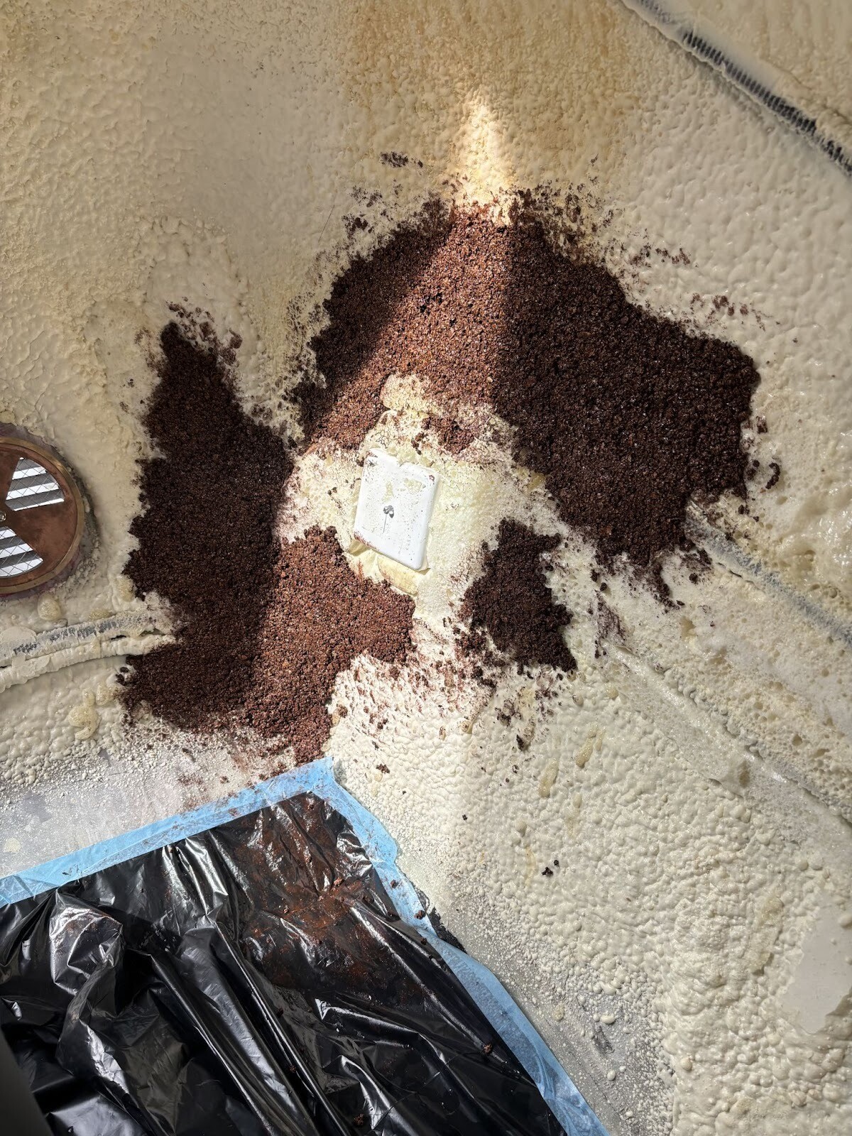 Nästa steg var att testa det på plats i husvagnen. Då PU-skummet är trimmat på sina ställen så kändes det vettigt att täcka ytorna med ett lager silikon först. Jag blandade därför silikon med kemiskt ren bensin till lämplig konsistens och målade detta i ett hörn bakom kaminen. Skippade pigmentet i detta då det ändå skulle täckas över med korkmassan. Det var dock i princip omöjligt att se var jag hade målat då det bara lämnade en tunn hinna av transparent silikon, men för detta test fick det duga. När det hade härdat blandade jag en testbatch med kork och silikon, för att vara på den säkra sidan tog jag 1:1.5 kork till silikon i vikt. Jag tillsatte även järnoxidpigmentet direkt till detta för att få en mörk yta att limma på. Det visade sig vara väldigt svårt att få till en jämn beläggning då massan hellre ville fastna på handskarna än på väggen. Jag kladdade ut näve efter näve med vad som liknade en smulpajsdeg med choklad. Efter att massan var utsmetad på de värsta delarna av testhörnet så bytte jag handske och mha en sprayflaska med diskmedelsvatten kunde jag trycka och jämna till det ganska bra.