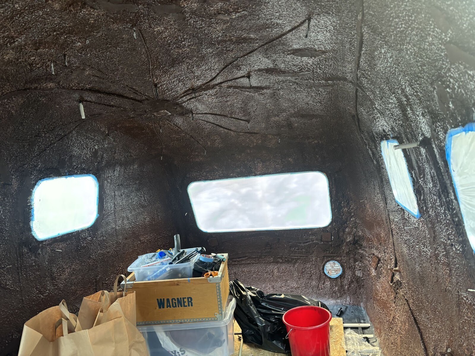 Det var mycket jobbigare att måla ut detta än jag hade förväntat mig. Stanken från bensinen var obehaglig och väggarnas bubbliga och ojämna yta gjorde att det tog väldigt mycket tid att få en jämn täckning. Jag målade några timmar varje dag efter jobbet och efter en vecka, elva tuber silikon, fyra liter bensin samt blod svett och timmar så var vagnen helt brun invändigt. Vi fick nu flashbacks från när vi rev inredning och isolering och hittade det bruna limmet på väggarna. Det kändes som att vi var tillbaka där vi började men med en ganska mycket bättre grund.