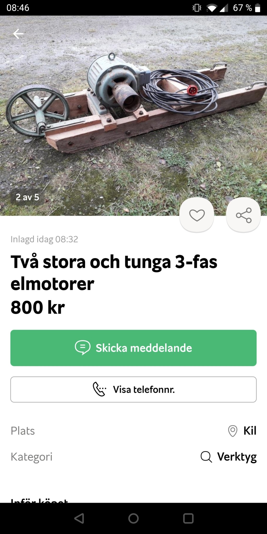 Bra idé med pumparna, kom på att motorn som kör cirkelsågen i sågverket är en gammal 22kw Asea på 2800rpm. Den har drivit en pump i ett vattenverk. Där körs klingan på ca 1600rpm, 70cm i diameter