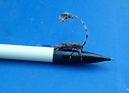 Timmerman skulle jag tro, http://sv.wikipedia.org/wiki/Större_timmerman. Tydligen inget skadedjur men det är förstås inte omöjligt att den har provsmakat lite ändå.