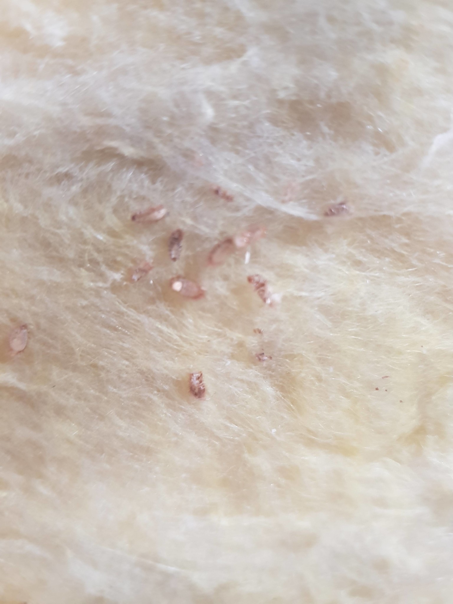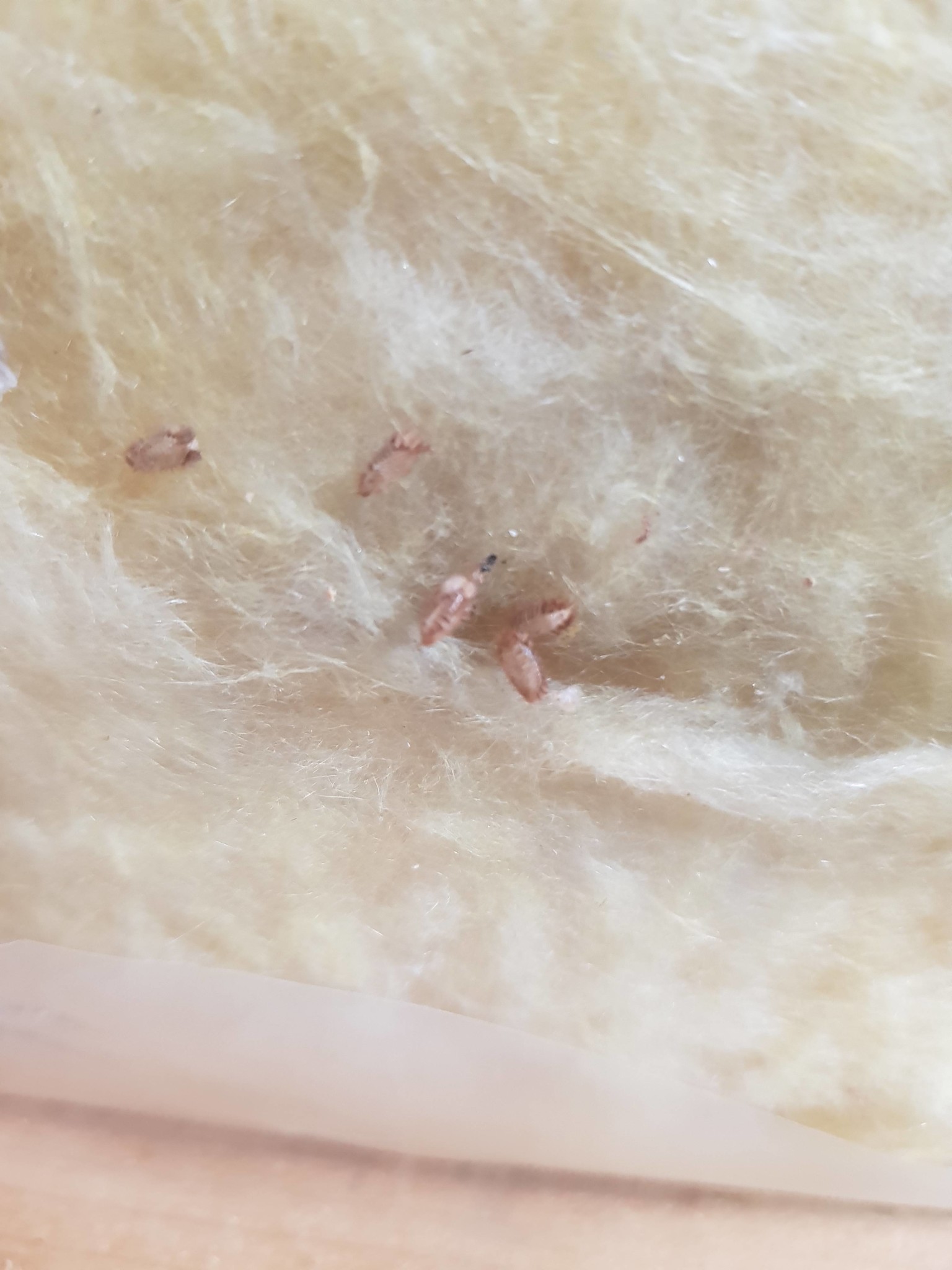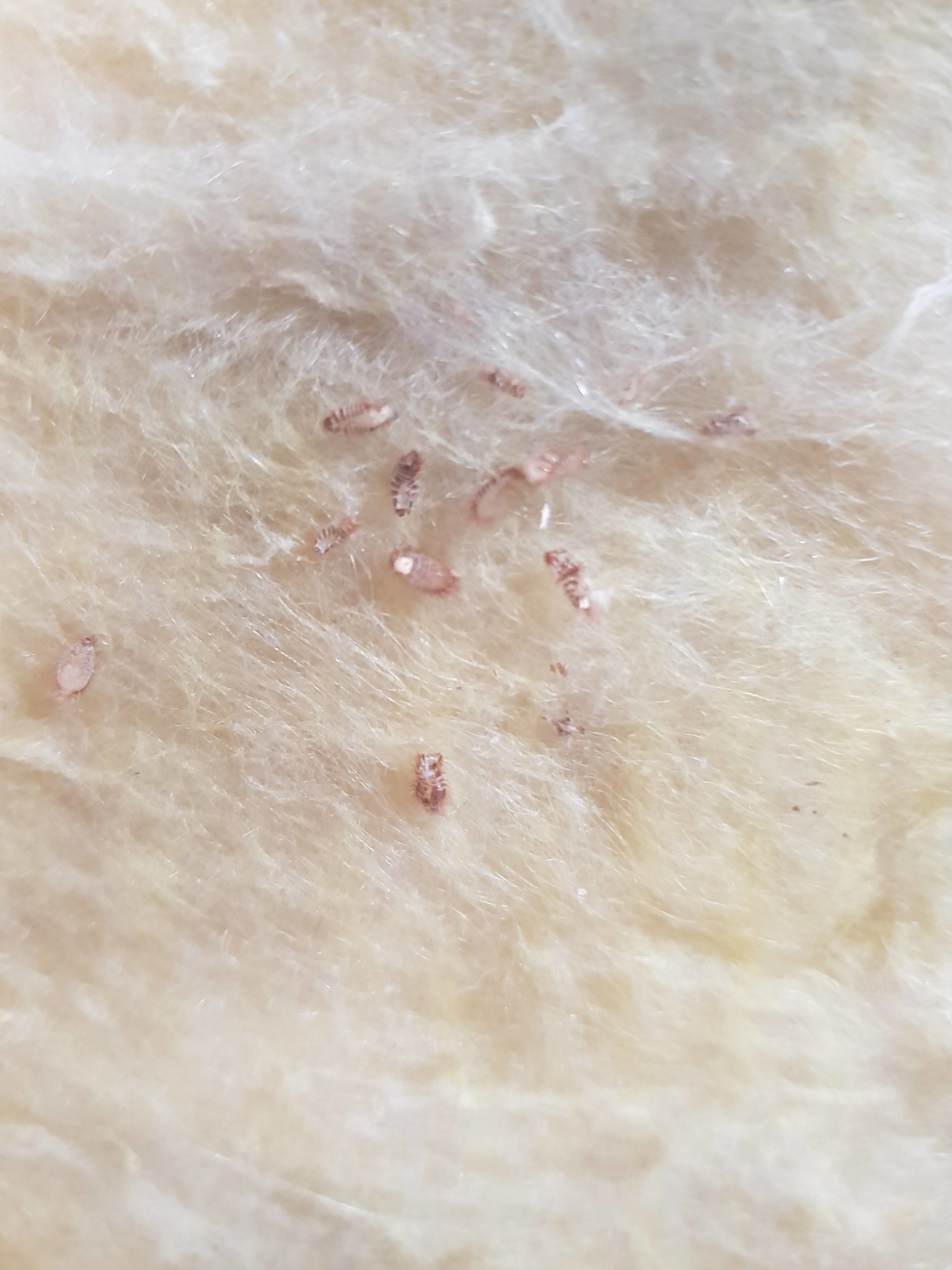 Hej, jag håller på att renovera ett sovrum med innertak delvis under ena sidovinden. Pga mörka fläckar i isoleringen så skar jag ett hål i ångspärren ( byter innertaket) och hittade i närheten av de mörka fläckarna dessa små krabater, se bild. Är detta något att vara orolig över?