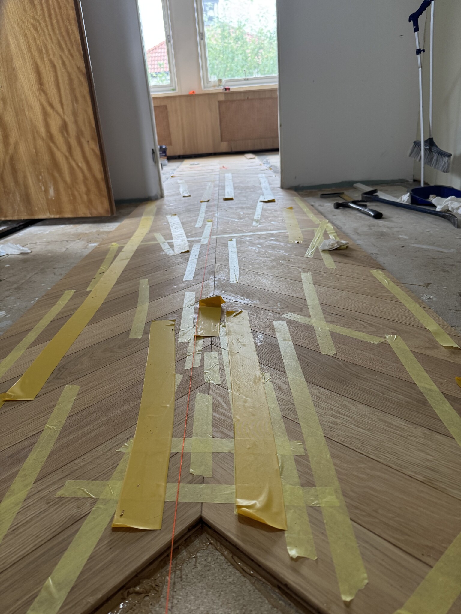 Efter en mycket sen leverans av parketten till övervåningen har jag påbörjat läggningen av golvet. Varje bit limmas en och en i chevron-mönster.
