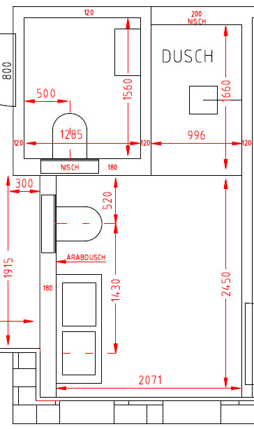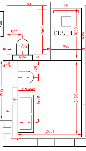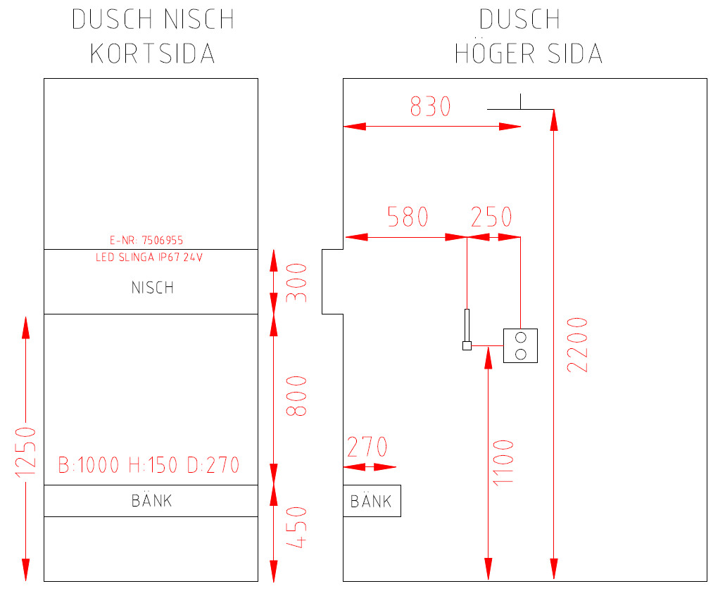 Alternativ B Dusch på långväggen och nisch i väggen på kortsidan